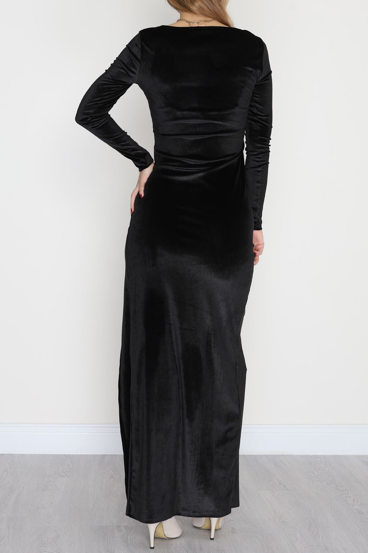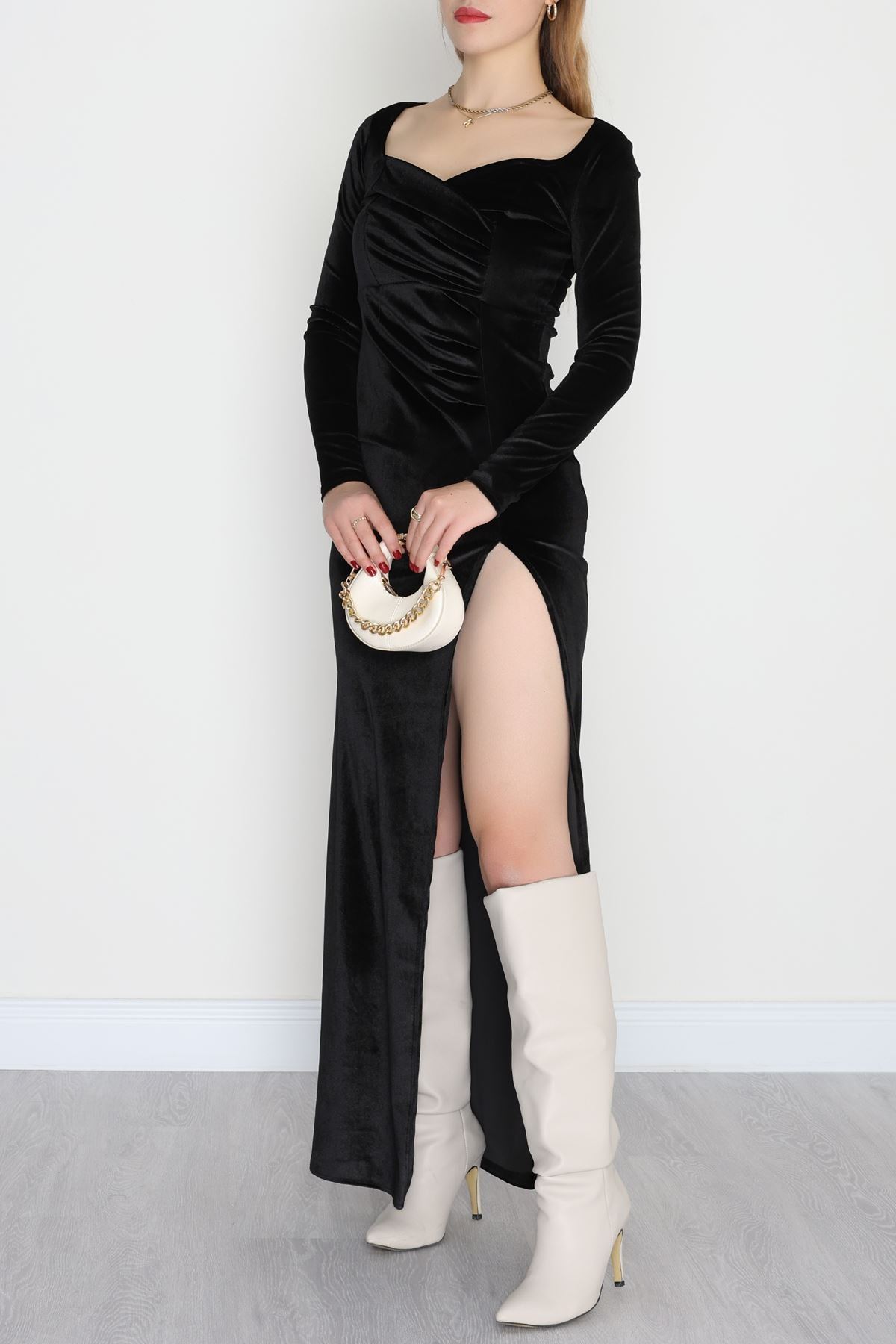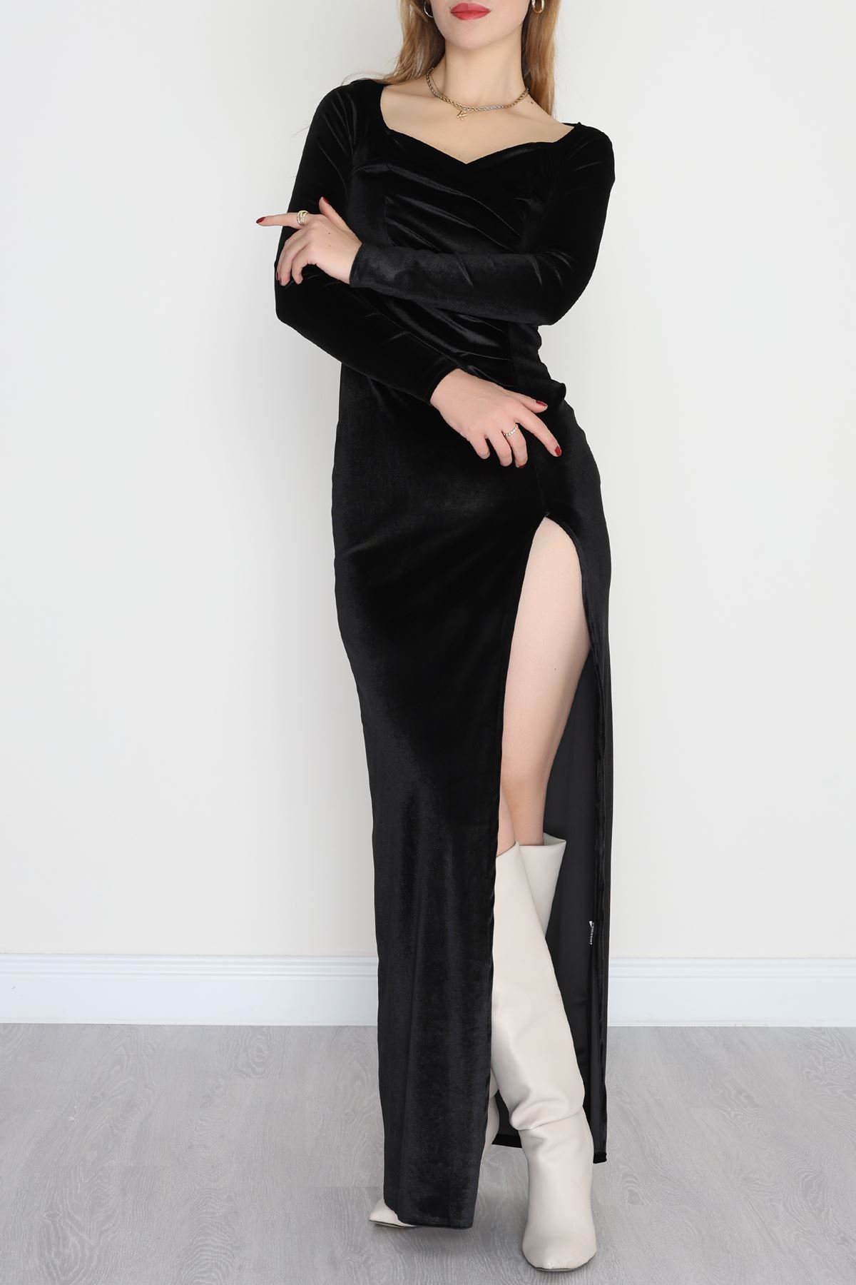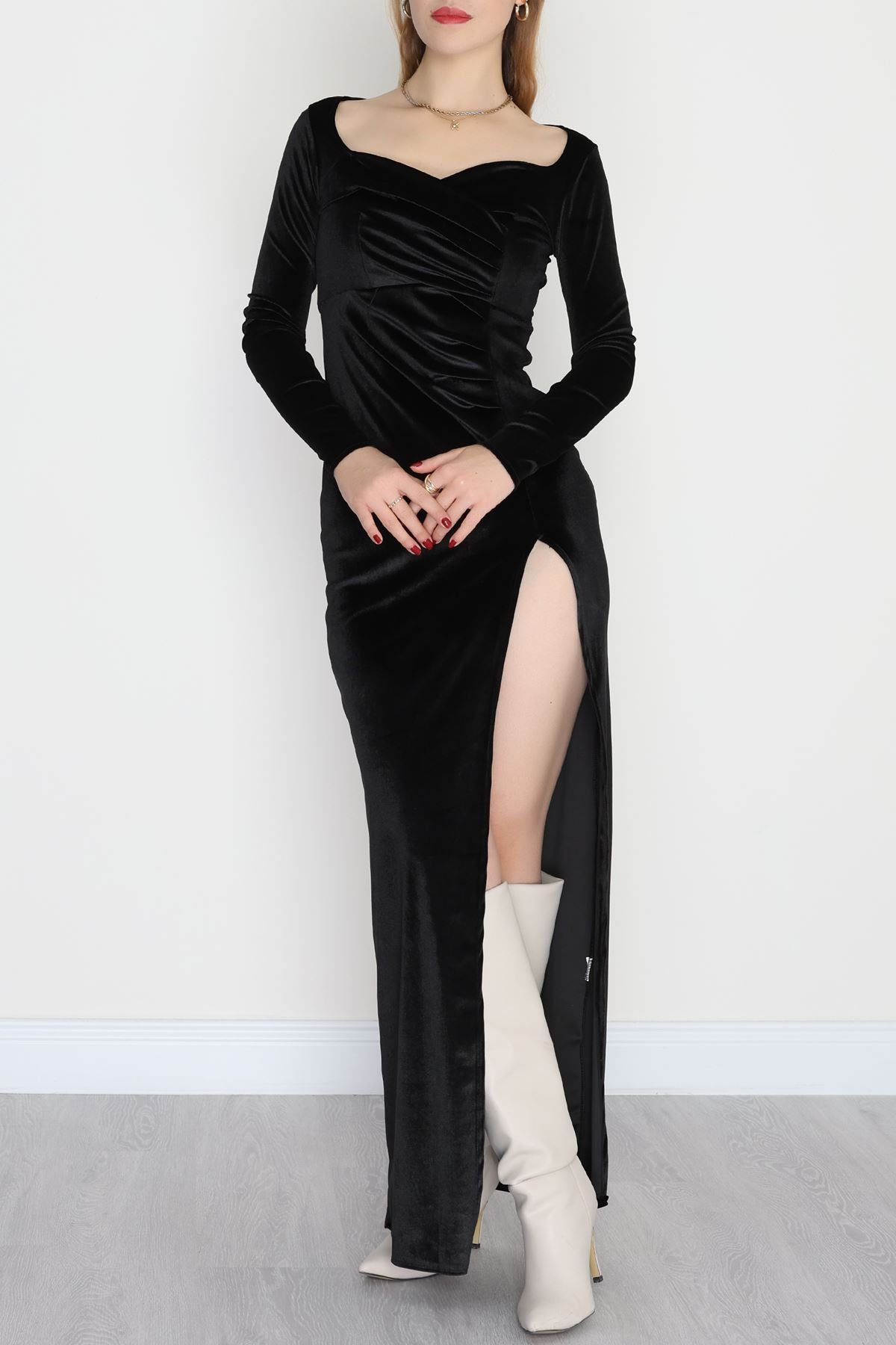 Kalp Yaka Kadife Elbise Siyah - 582294.1592.