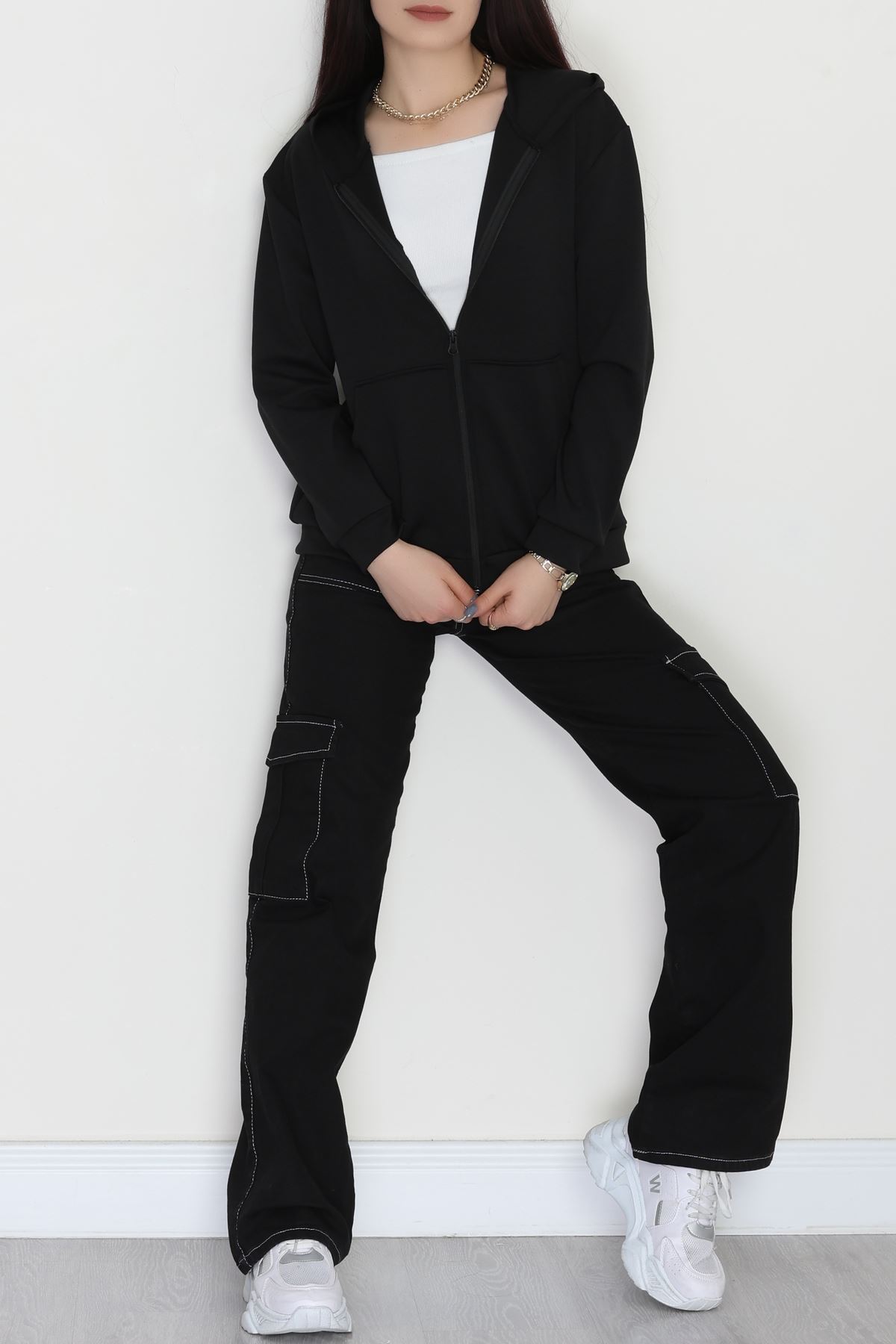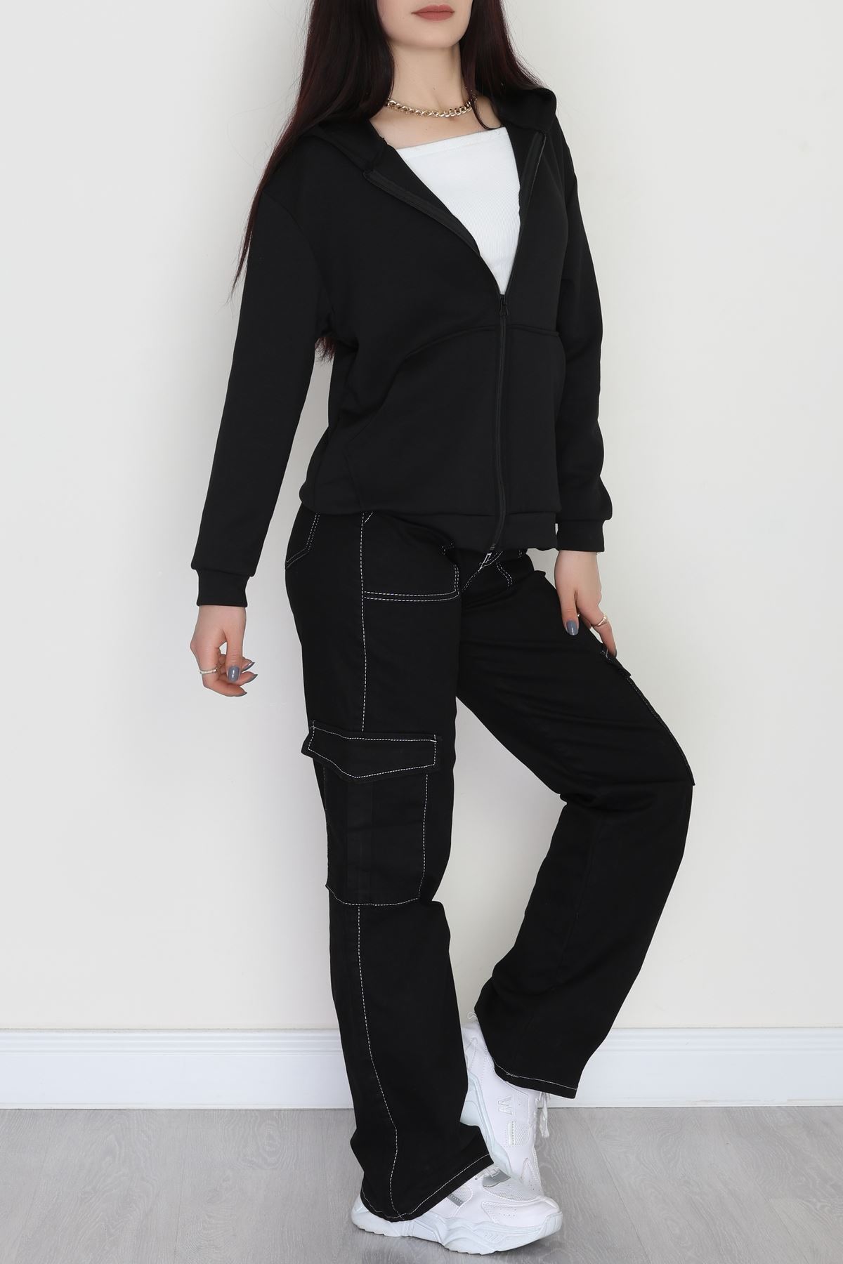 3 İplik Kanguru Cepli Kapşonlu Sweat Siyahbeyaz - 42253.1878.