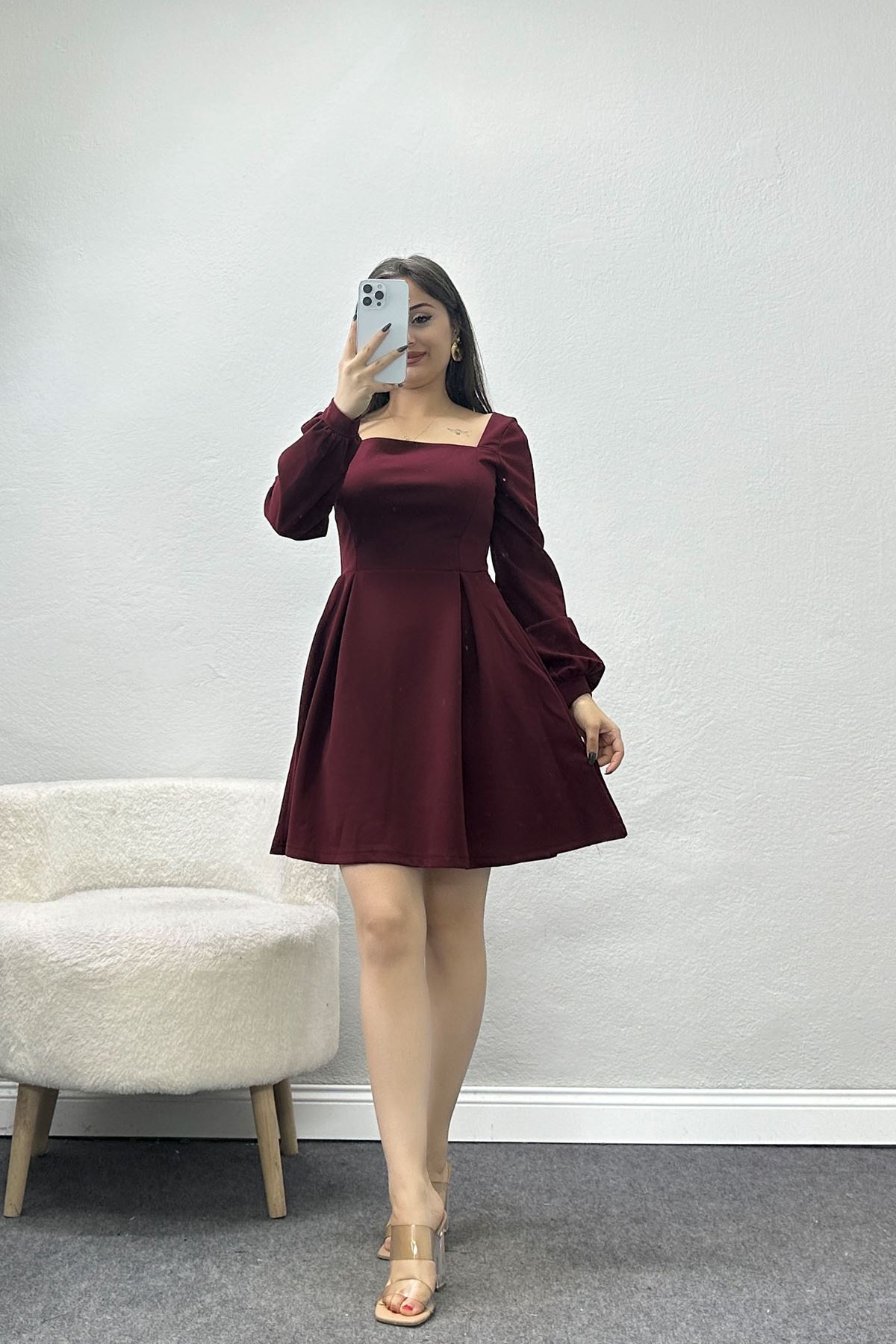 Kare Yaka Kloş İthal Krep Elbise Bordo - 582683.1592.