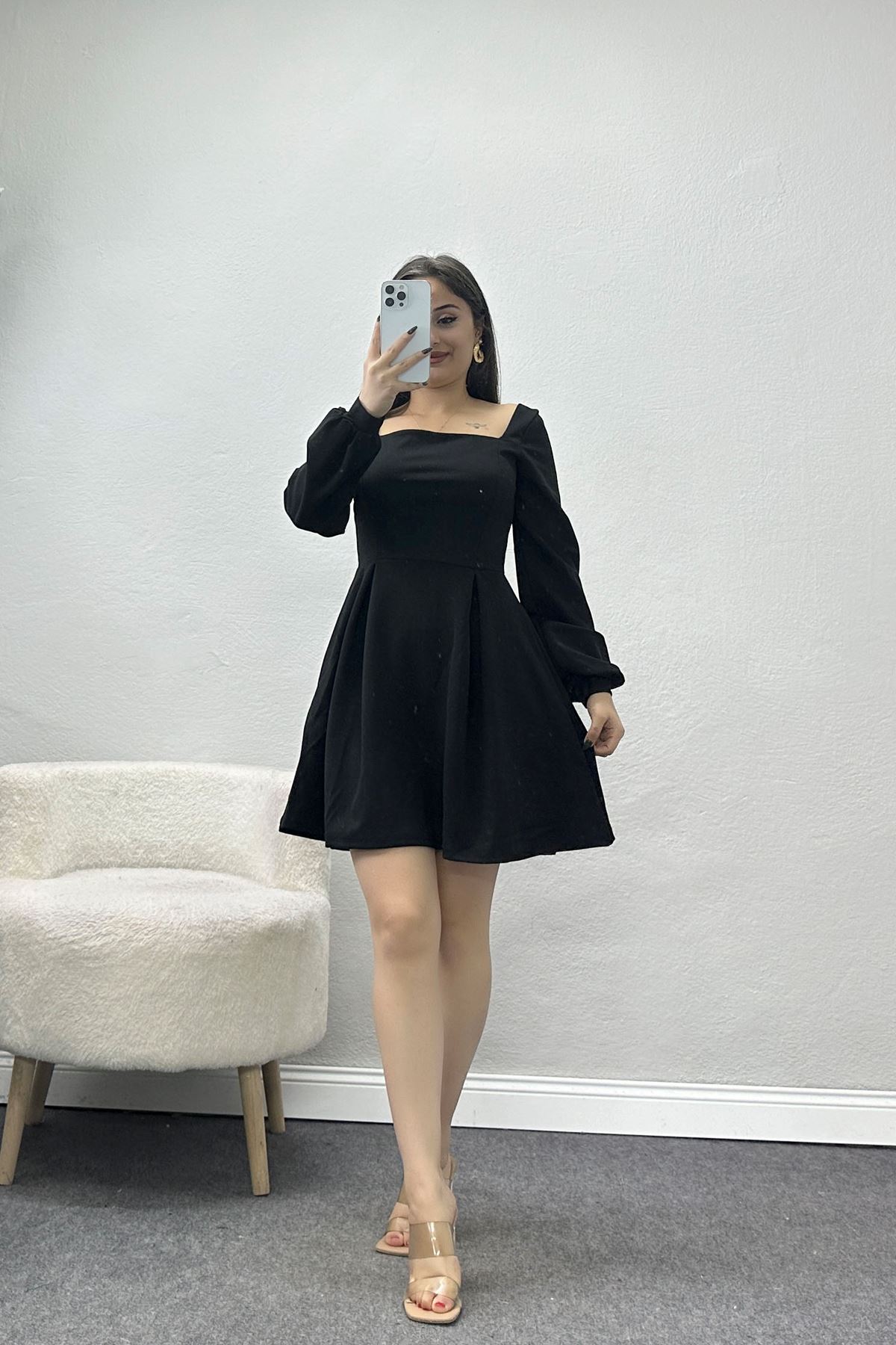 Kare Yaka Kloş İthal Krep Elbise Siyah - 582683.1592.