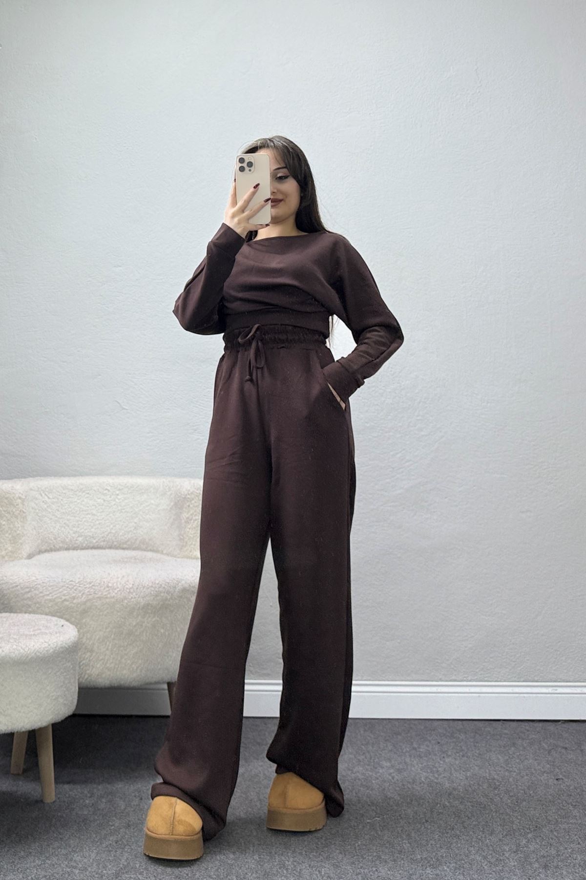 Kayık Yaka Modal Kumaş İkili Takım Kahve - 42673.1247.