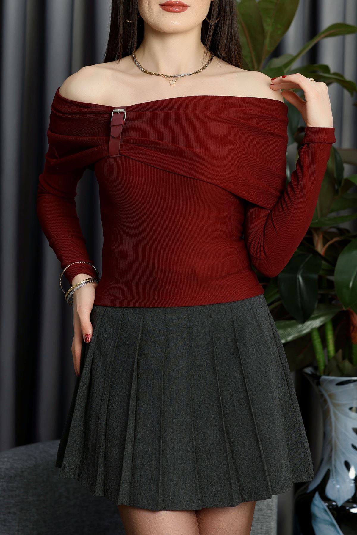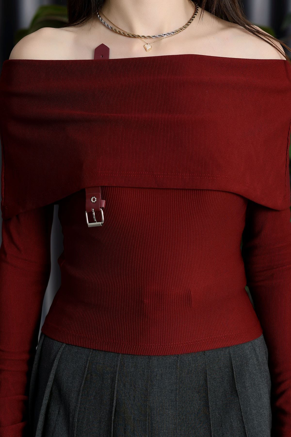 Kemer Detay Madonna Yaka Bluz Bordo - 7221.1918.