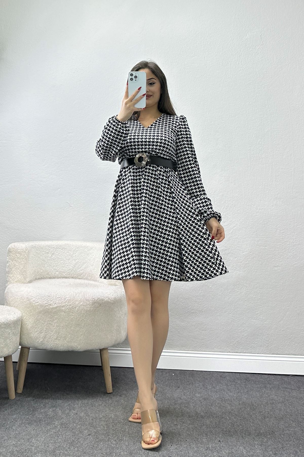 Kemer Detaylı Kaz Ayağı Kloş Elbise Siyahbeyaz - 581531.1592.