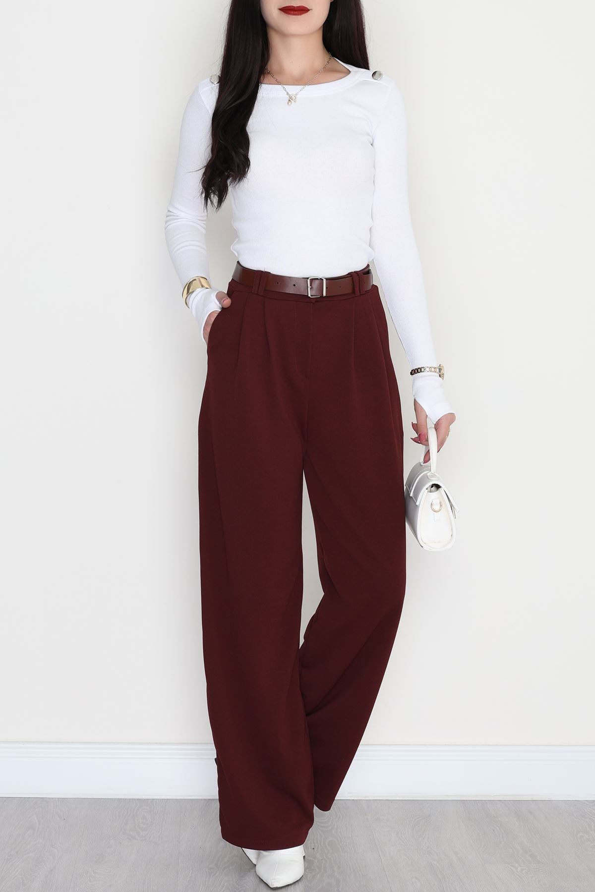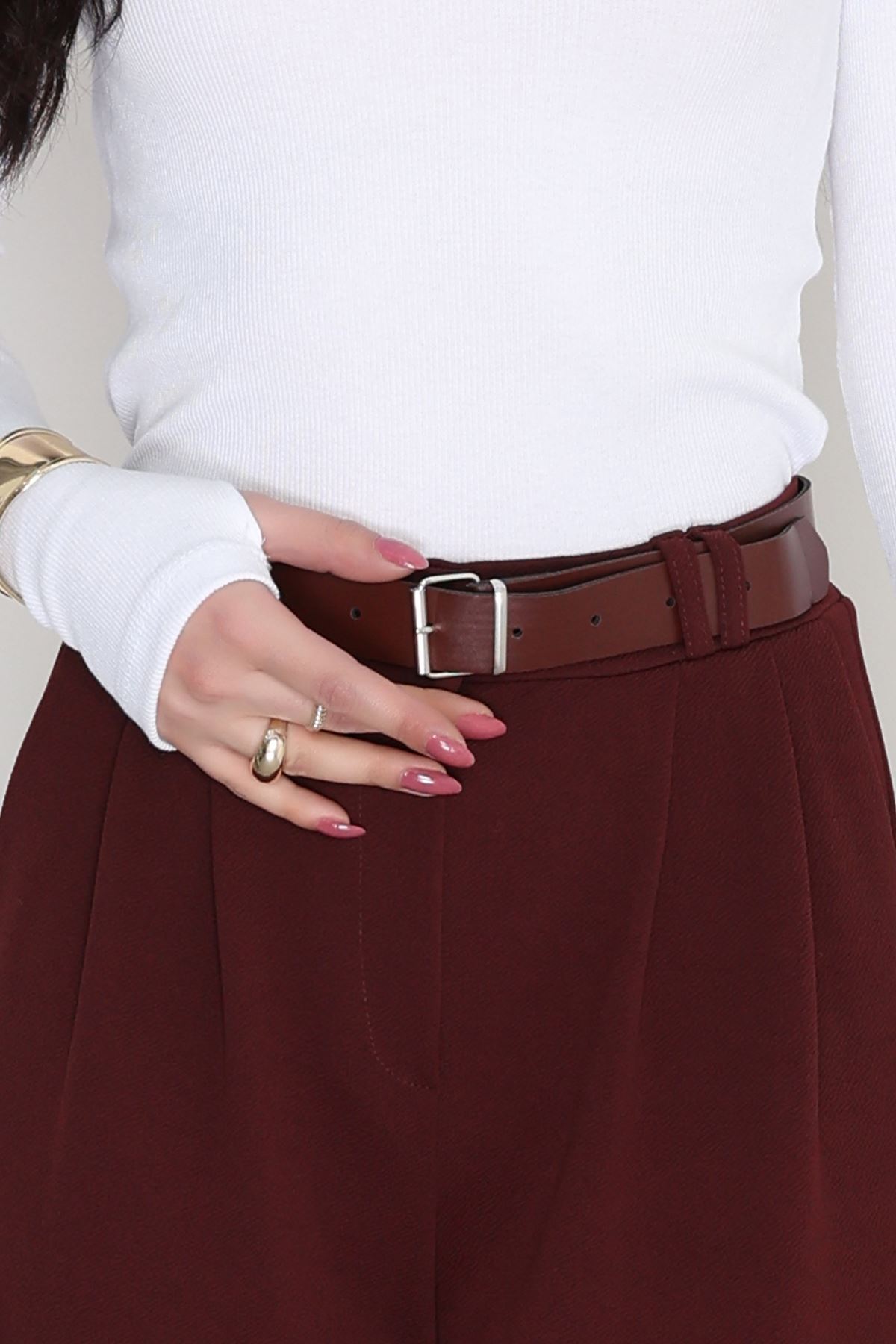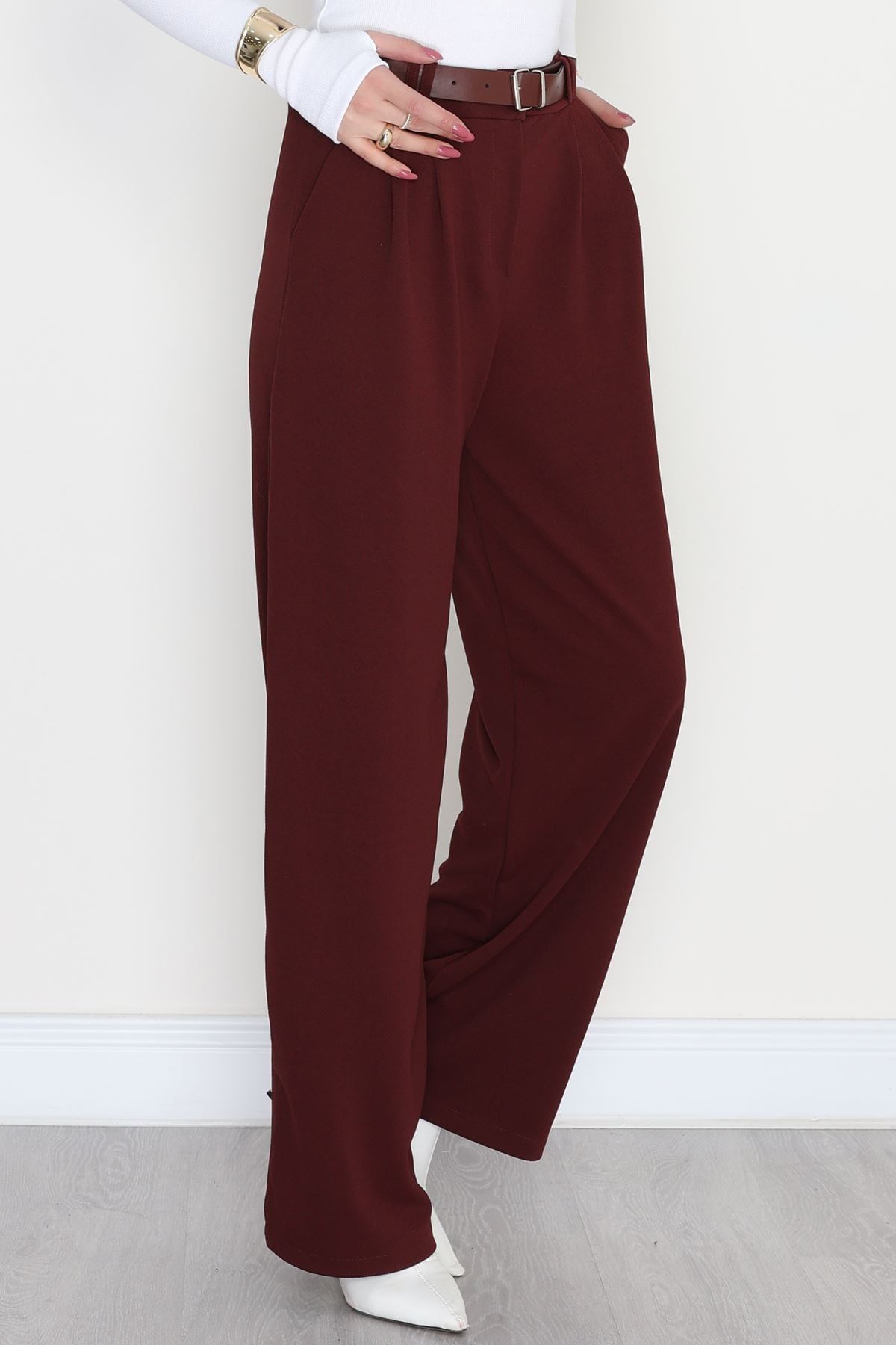 Kemerli Zra Krep Palazzo Pantolon Bordo - 30777.1865.