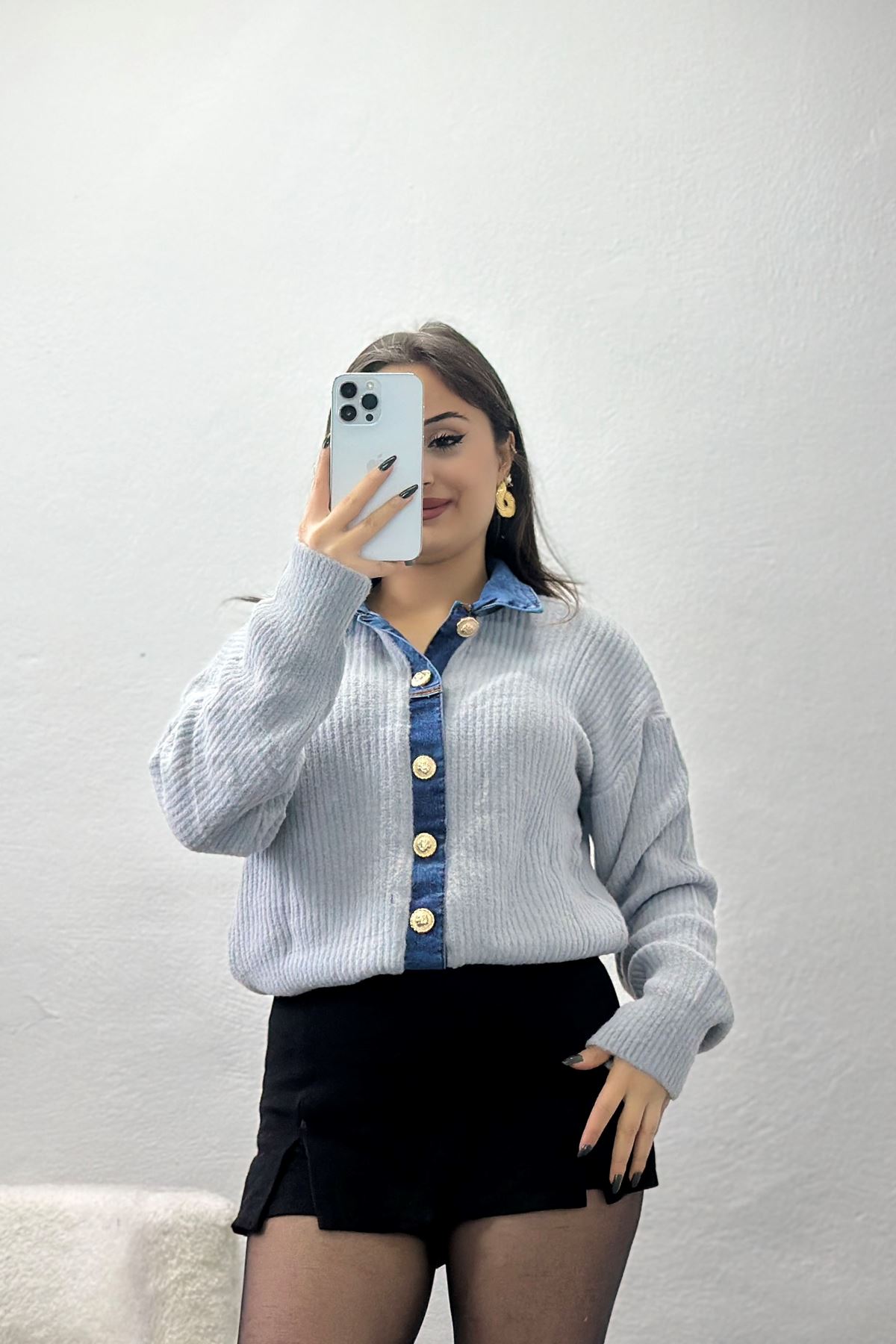 Kot Garnili Düğme Detay Hırka Gri - 70803.1765.