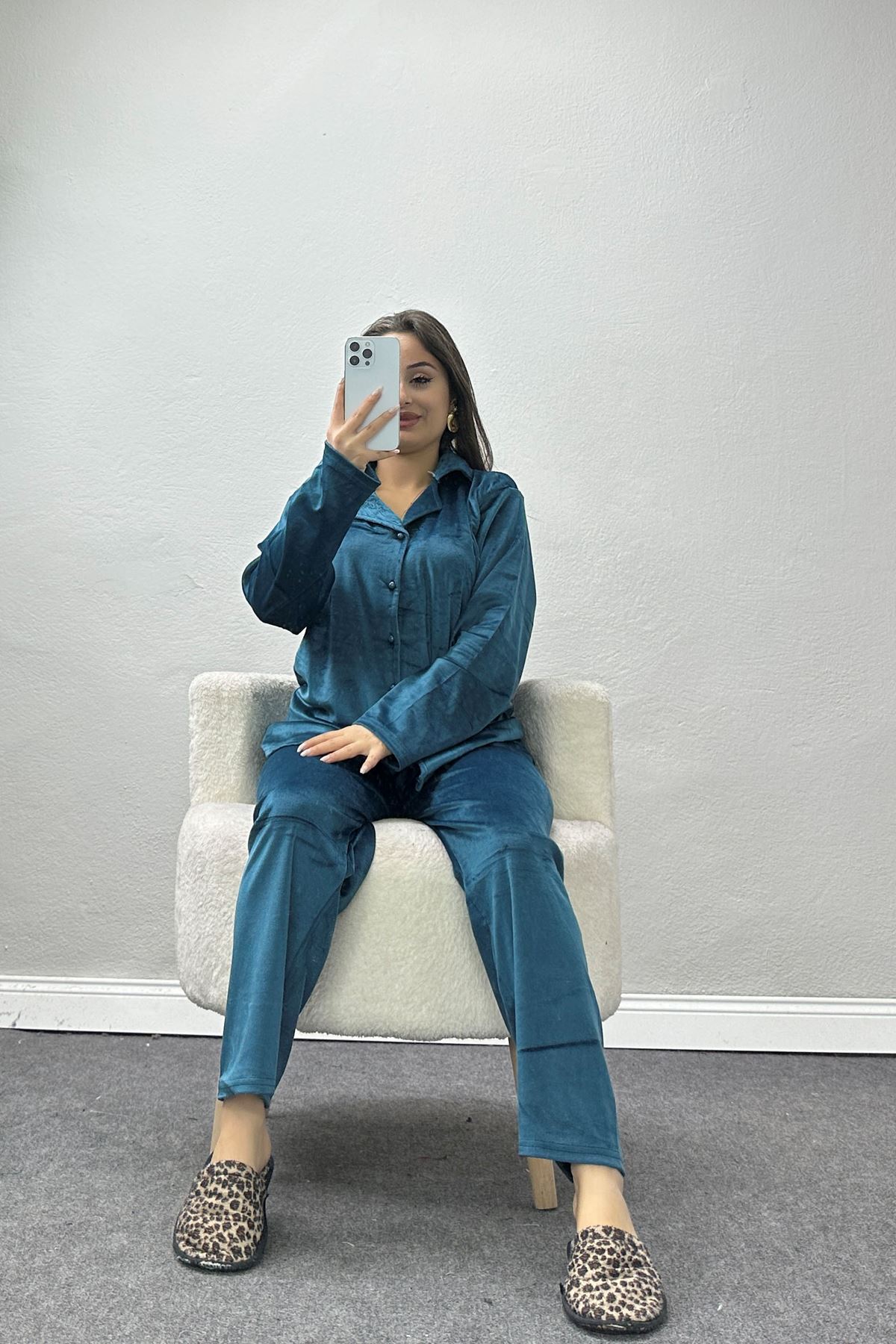 Likralı Fransız Kadife Düğmeli Pijama Takımı Petrol - 42069.1049.