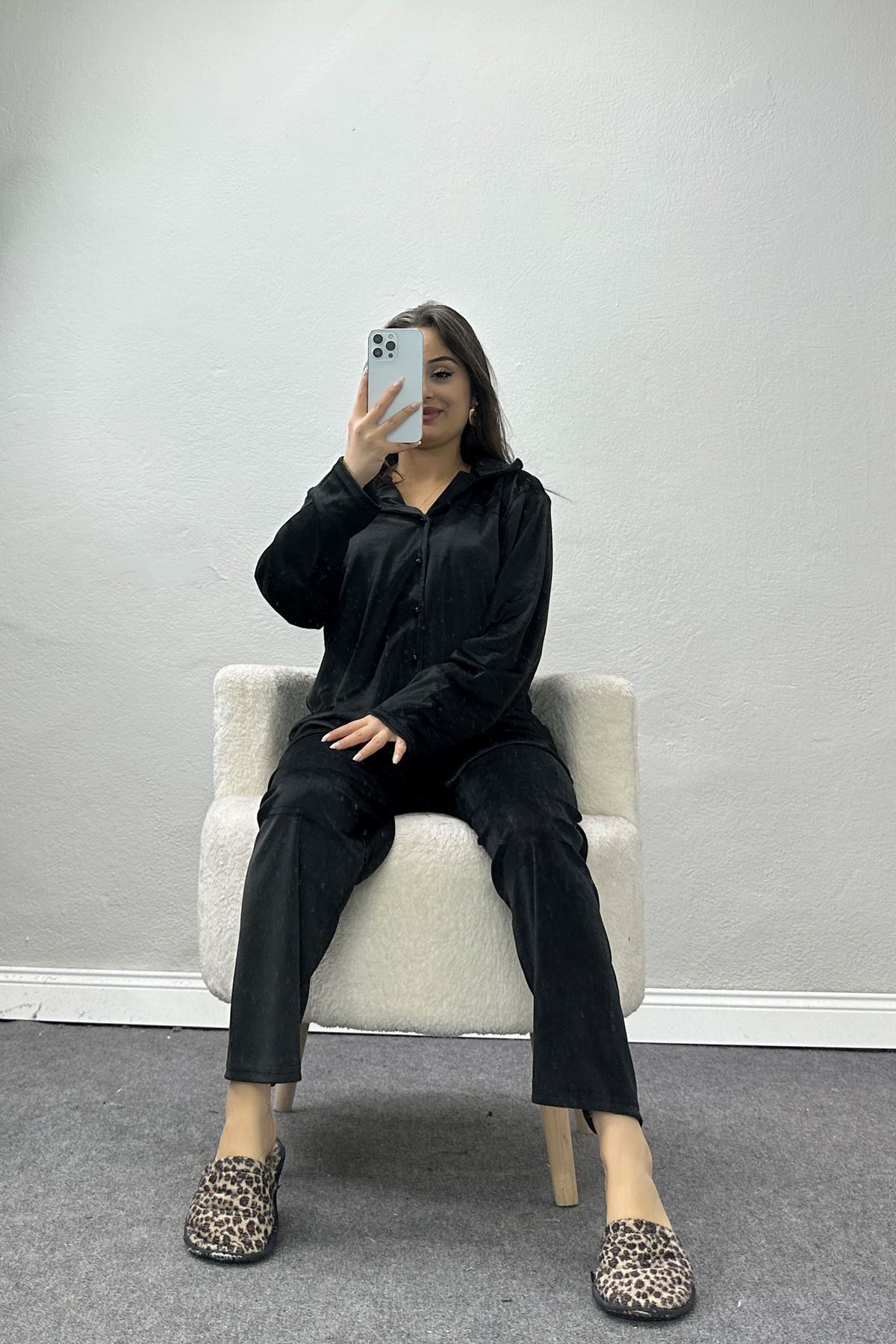 Likralı Fransız Kadife Düğmeli Pijama Takımı Siyah - 42069.1049.