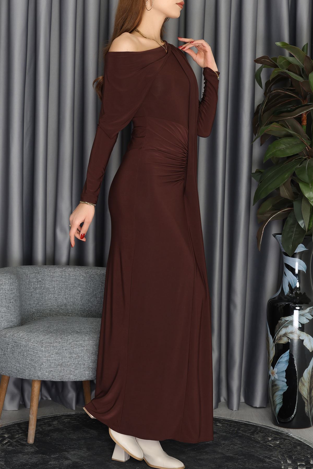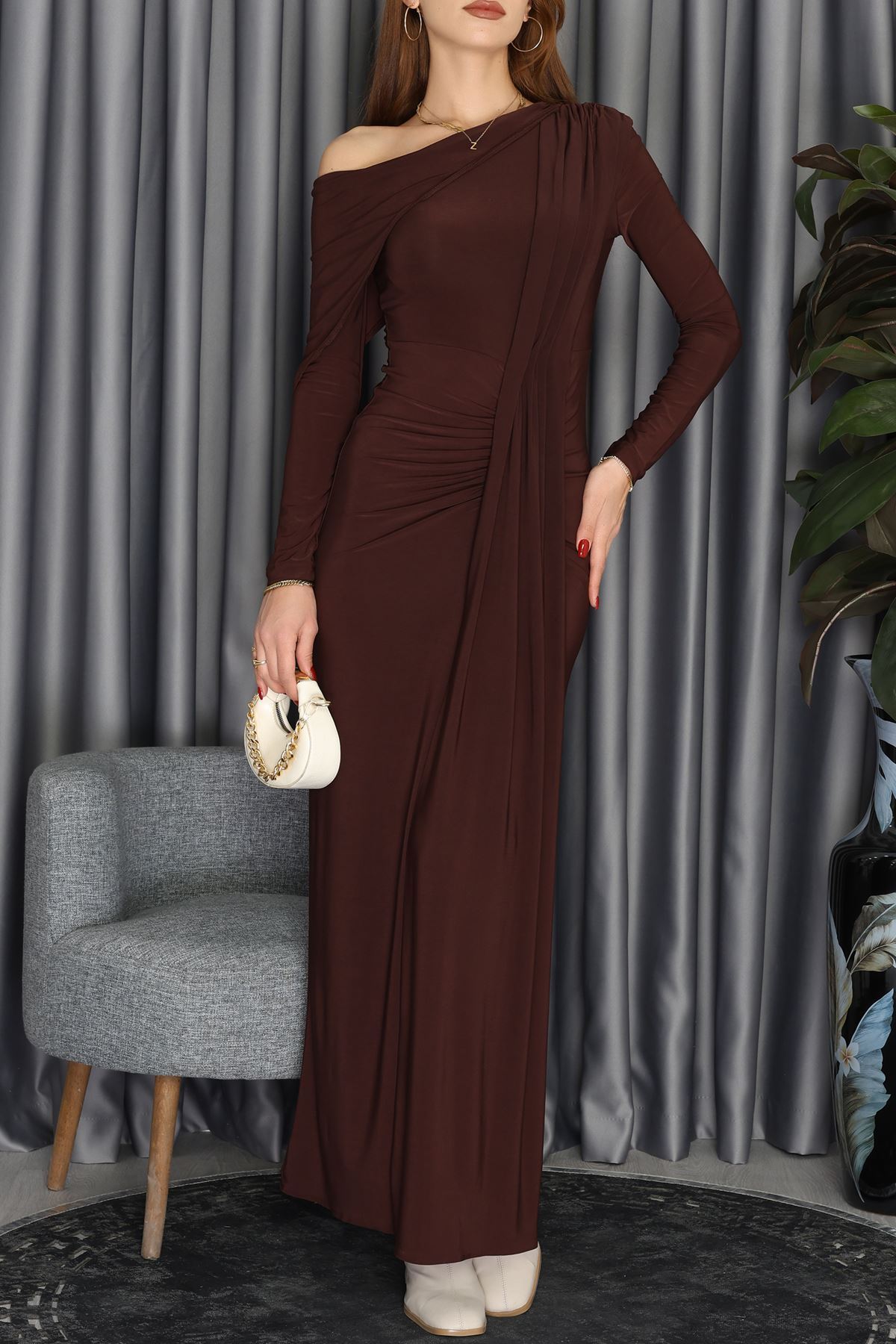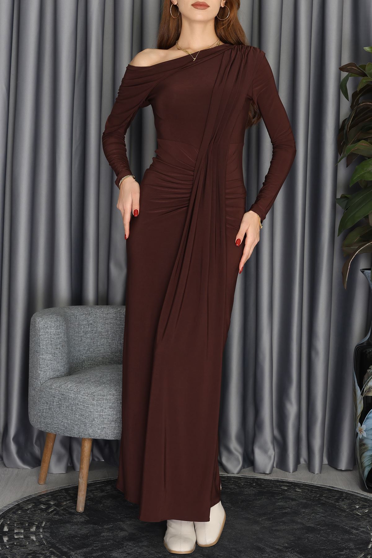 Loch Omuzdan Eteği Pileli Dökümlü Elbise Kahve - 2692.1997.