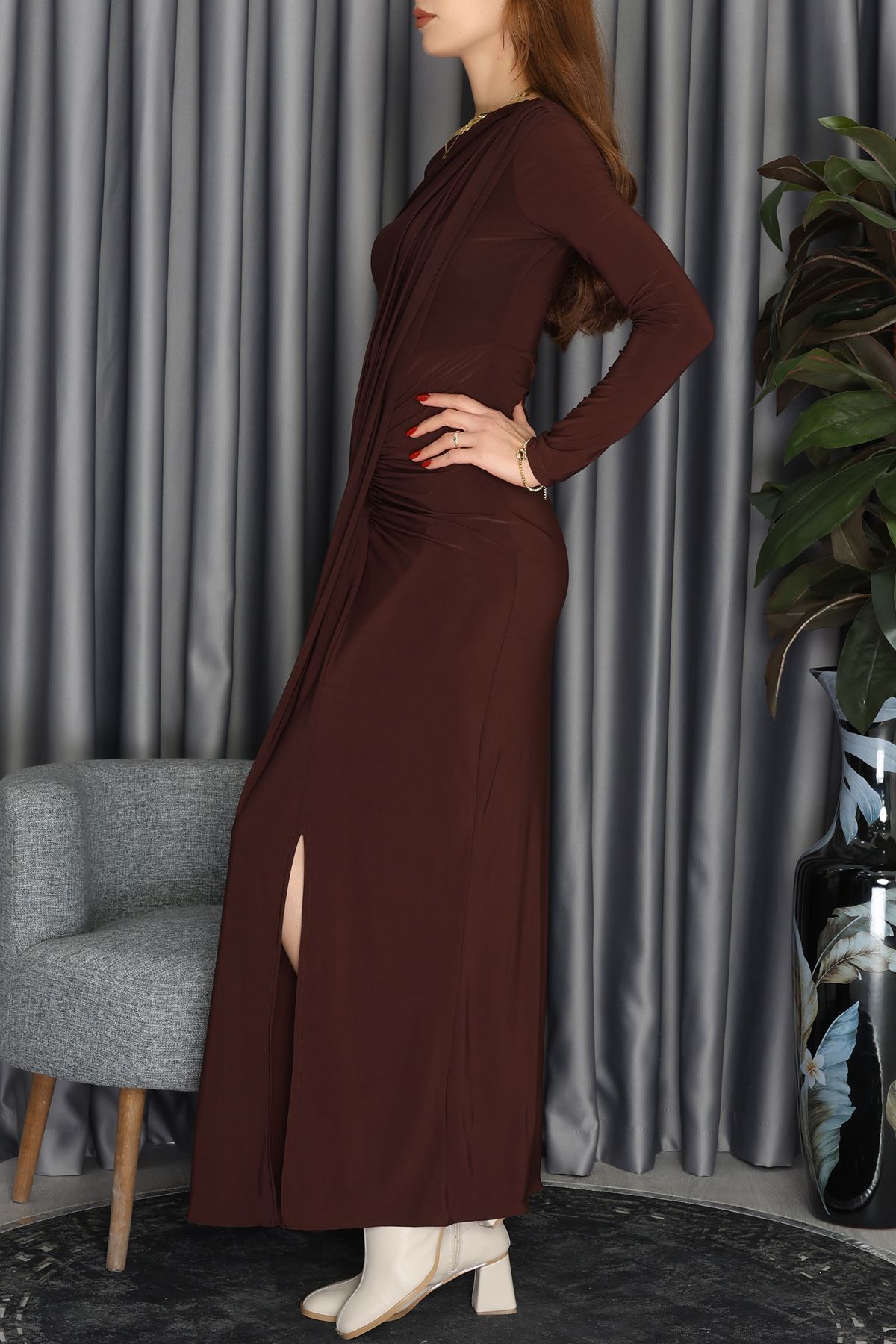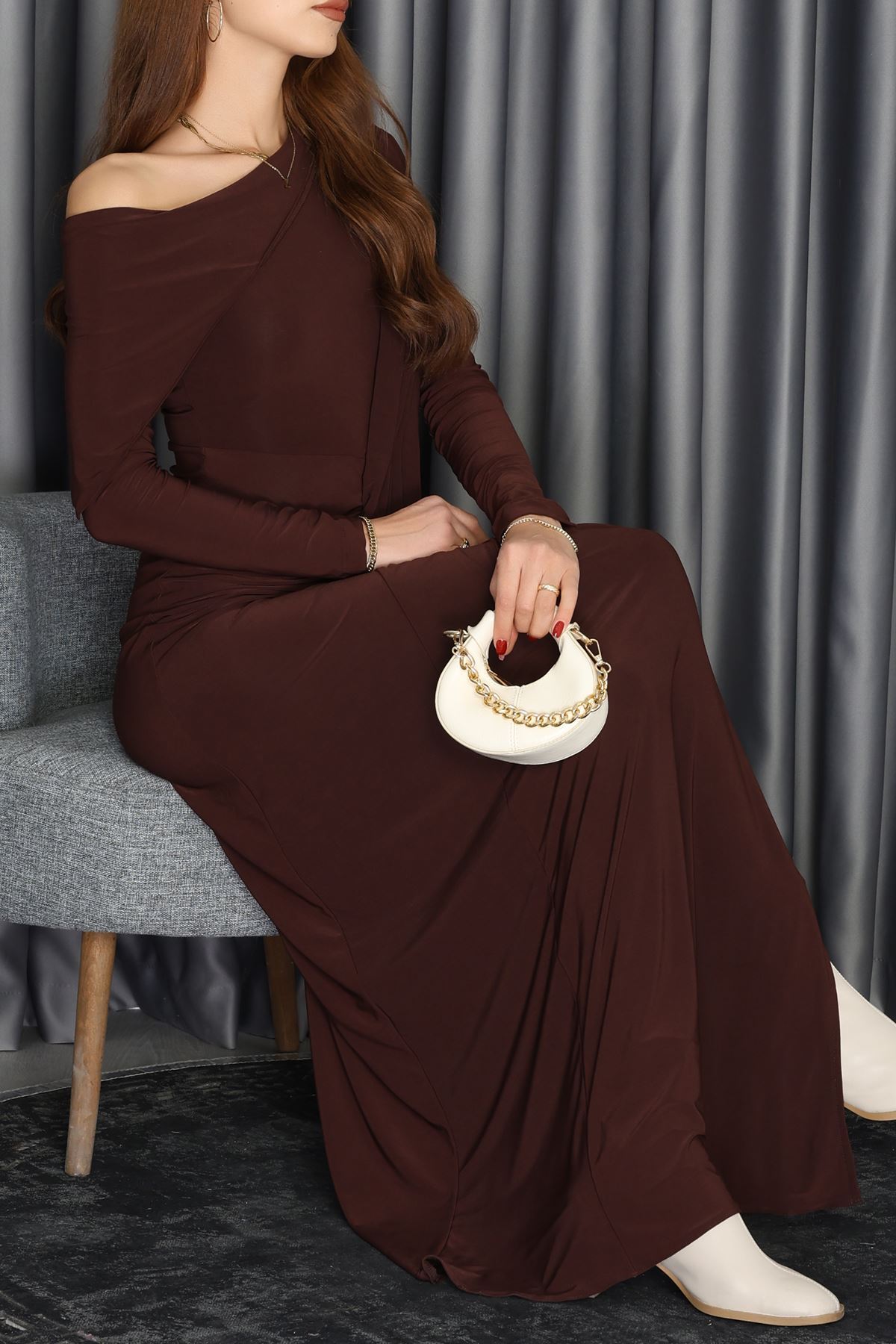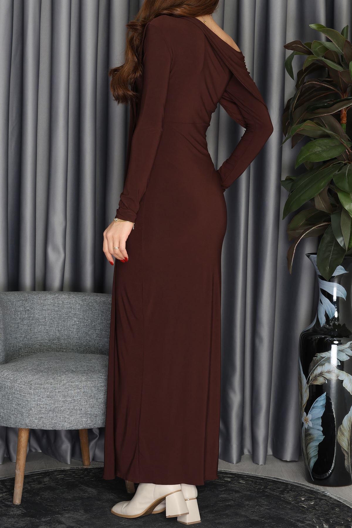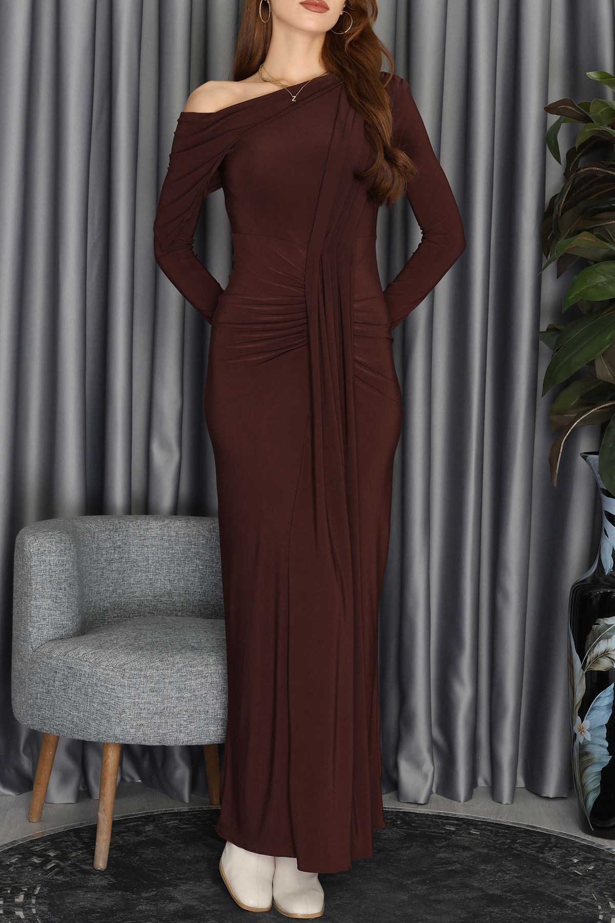 Loch Omuzdan Eteği Pileli Dökümlü Elbise Kahve - 2692.1997.