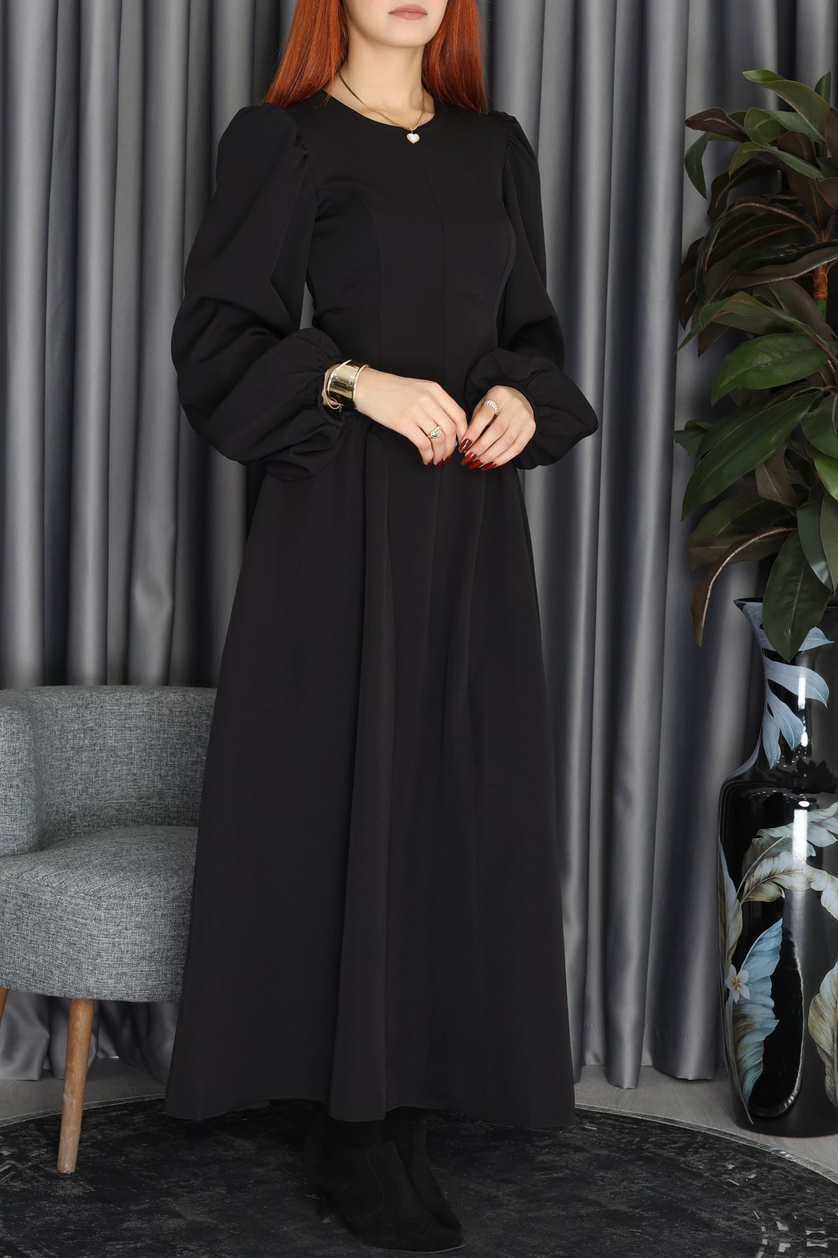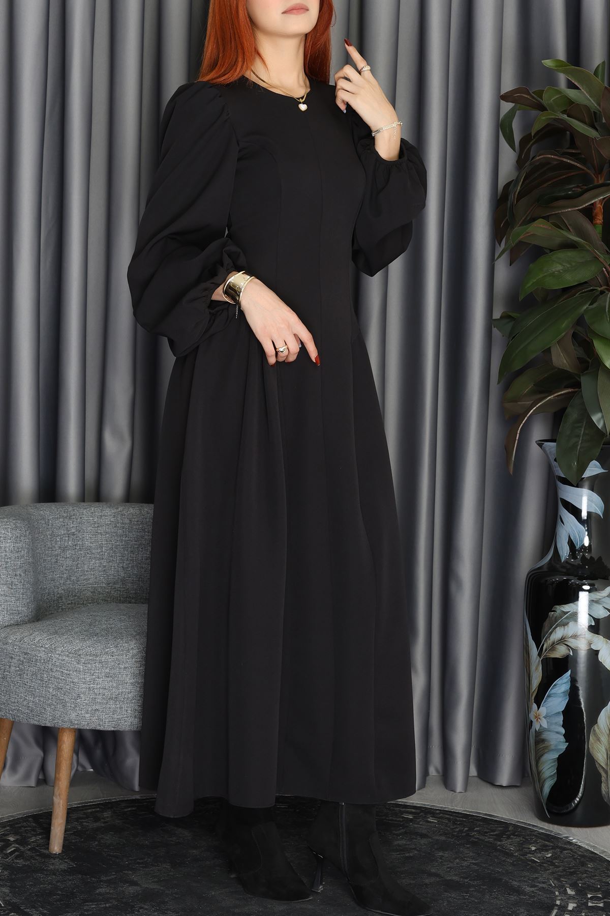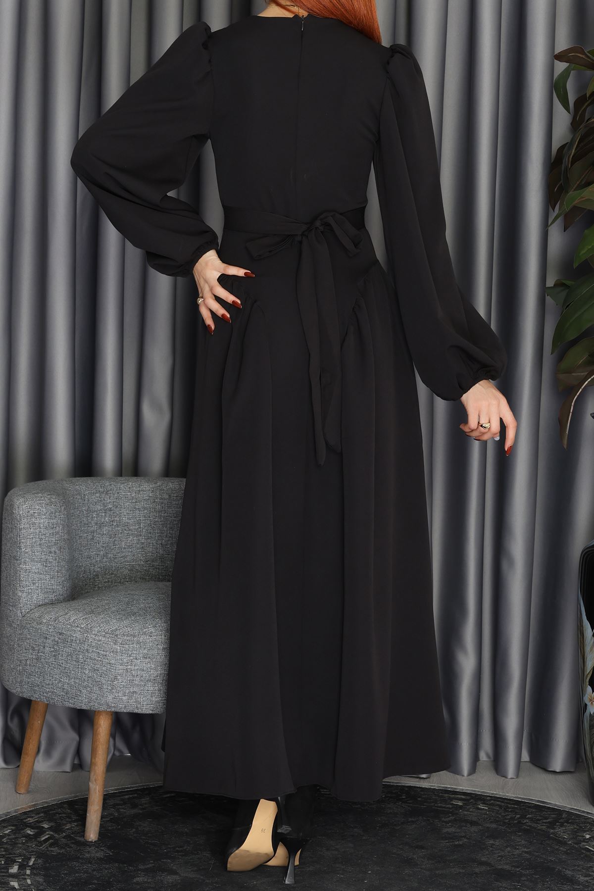 Loch Sırt Kuşak Bağlamalı Balon Kol Elbise Siyah - 2584.1997.