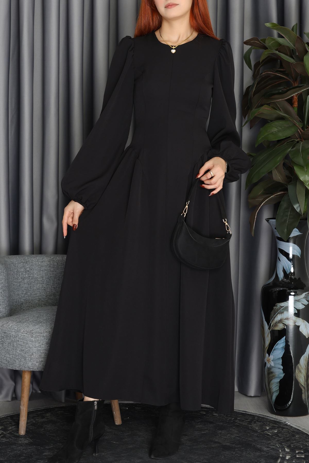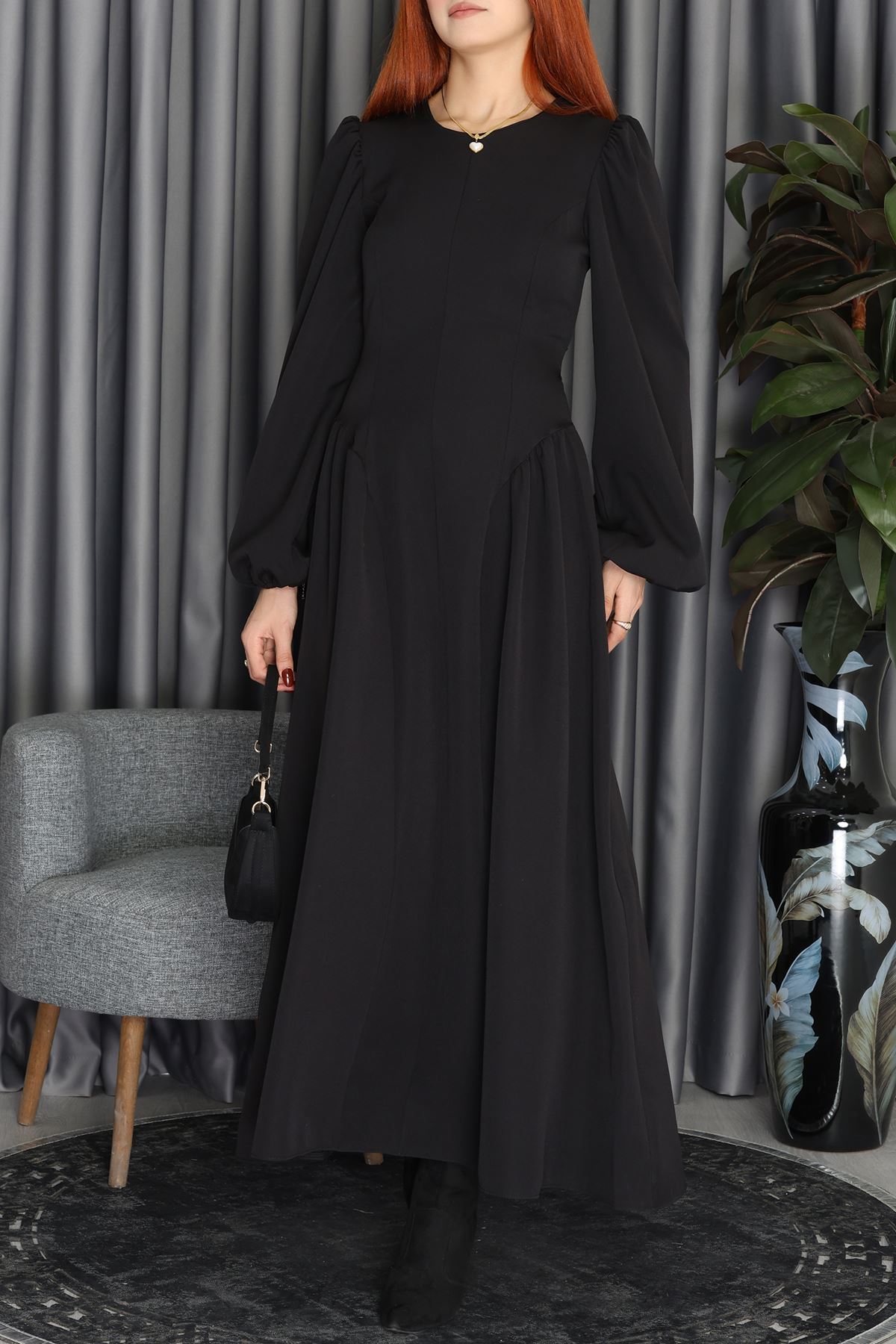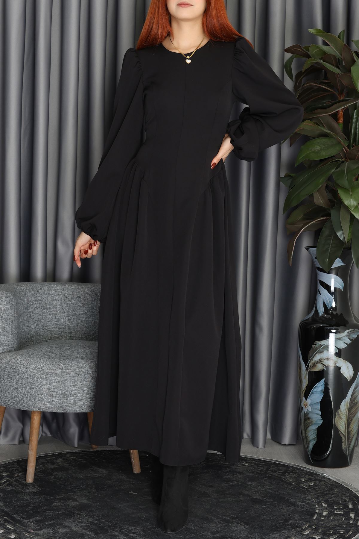 Loch Sırt Kuşak Bağlamalı Balon Kol Elbise Siyah - 2584.1997.