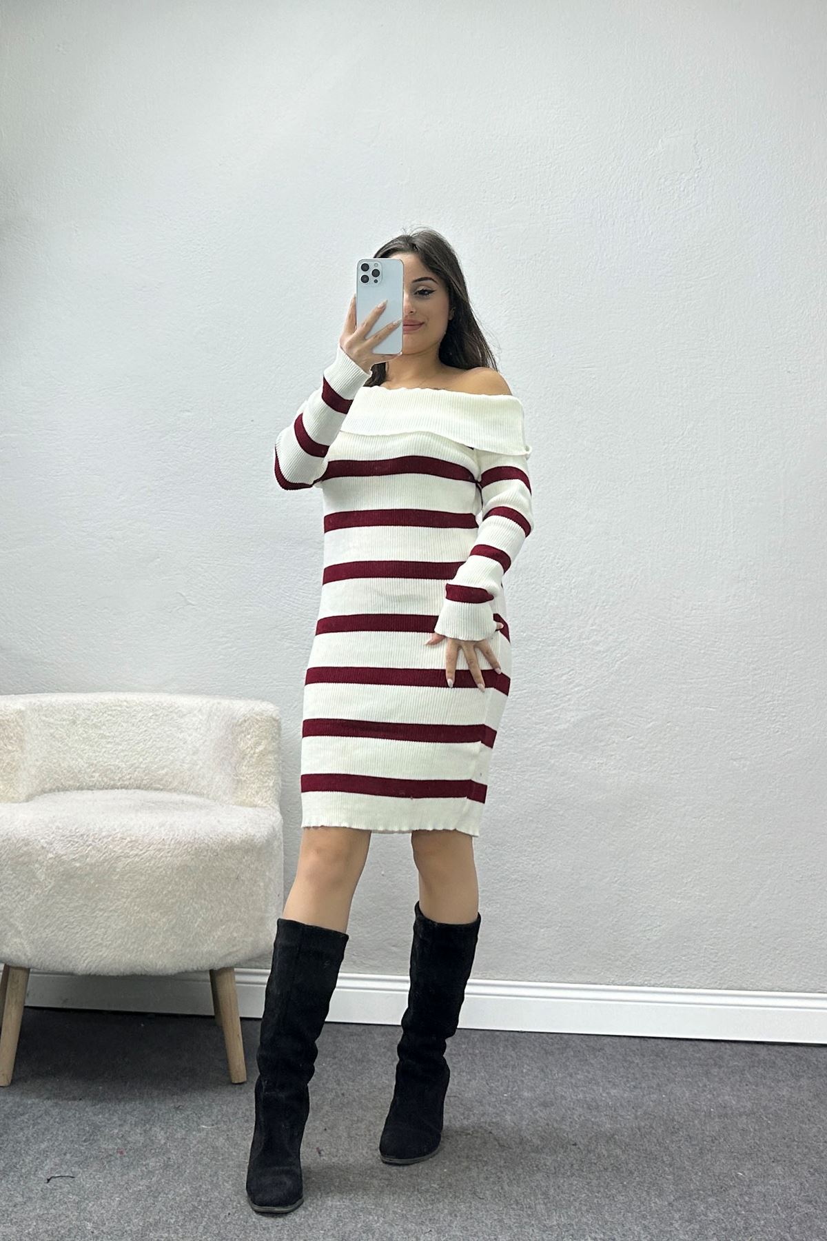 Madonna Yaka Çizgili Triko Elbise Bordobeyaz - 42545.1765.