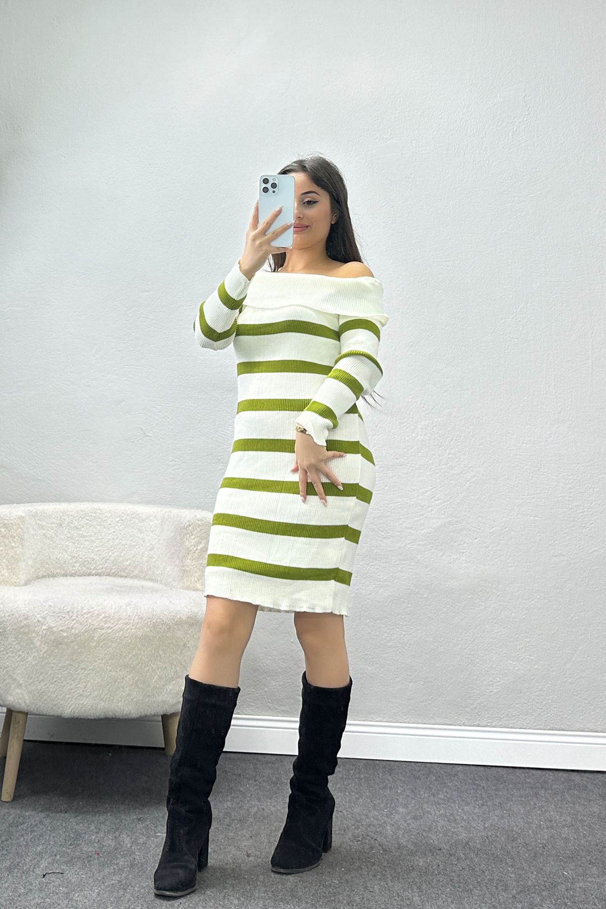 Madonna Yaka Çizgili Triko Elbise Yağyeşilibeyaz - 42545.1765.