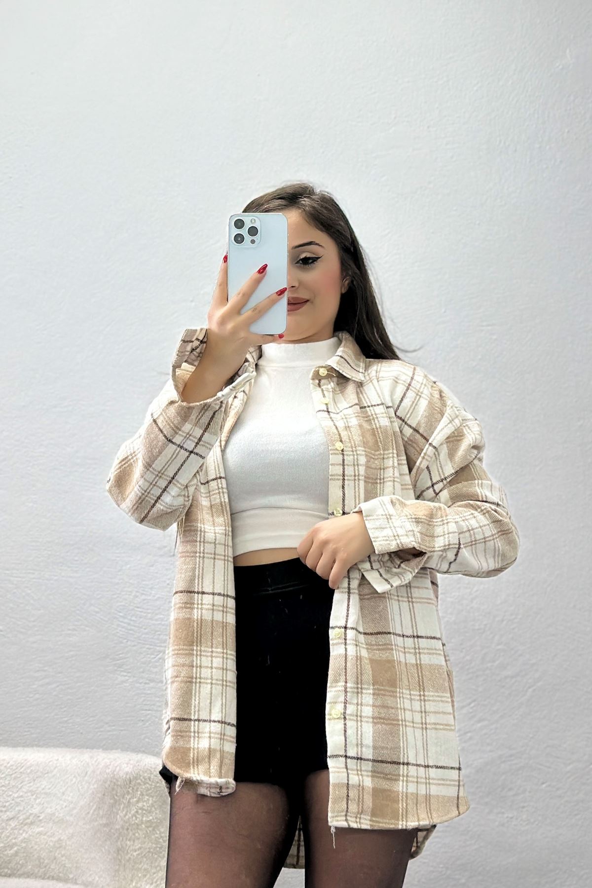Desenli Oversize Dokuma Gömlek Sütlükahve - 1802.1095.