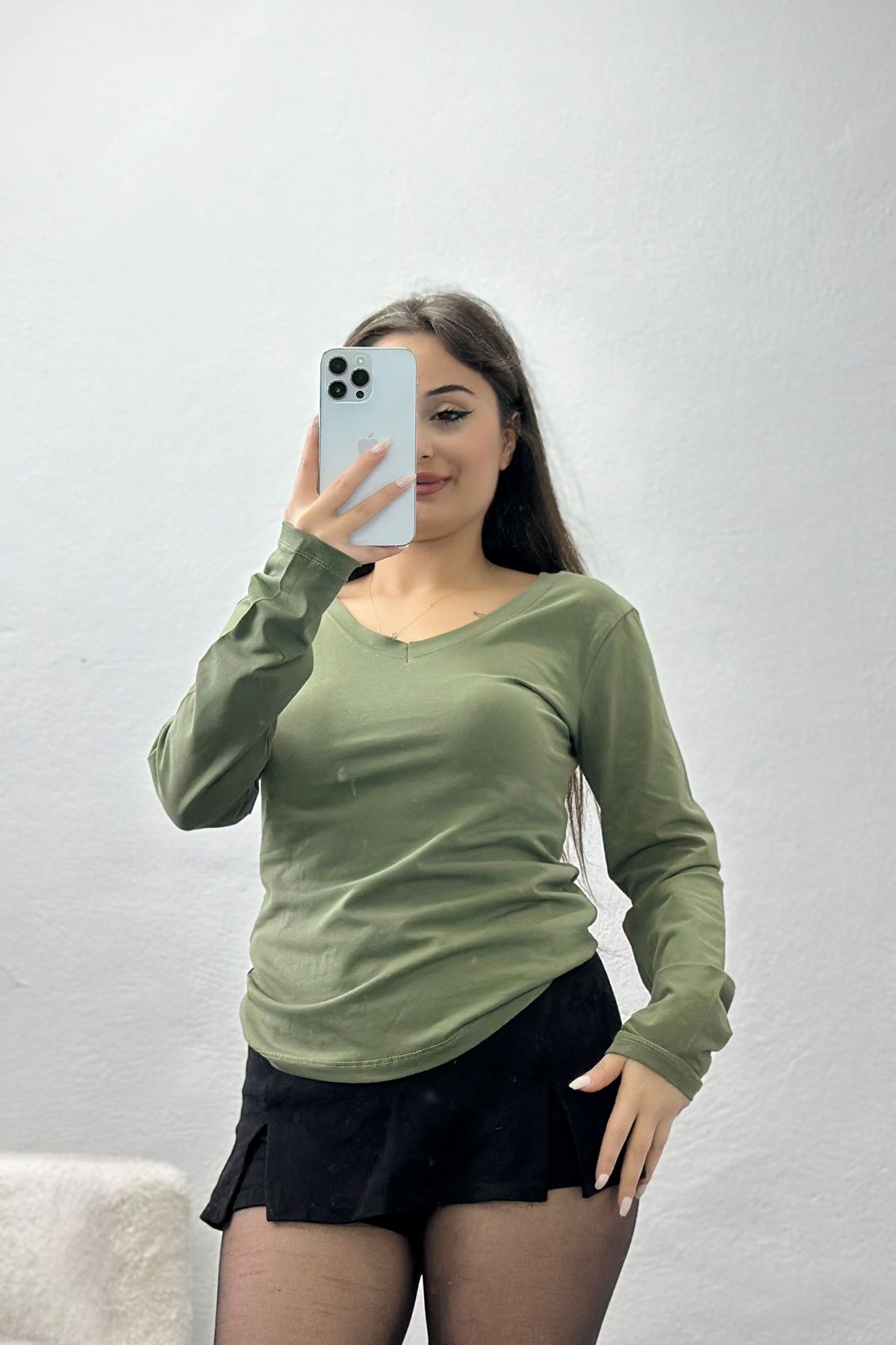Ön Arka V Yaka Likralı Kompak Body Haki - 90940.1878.
