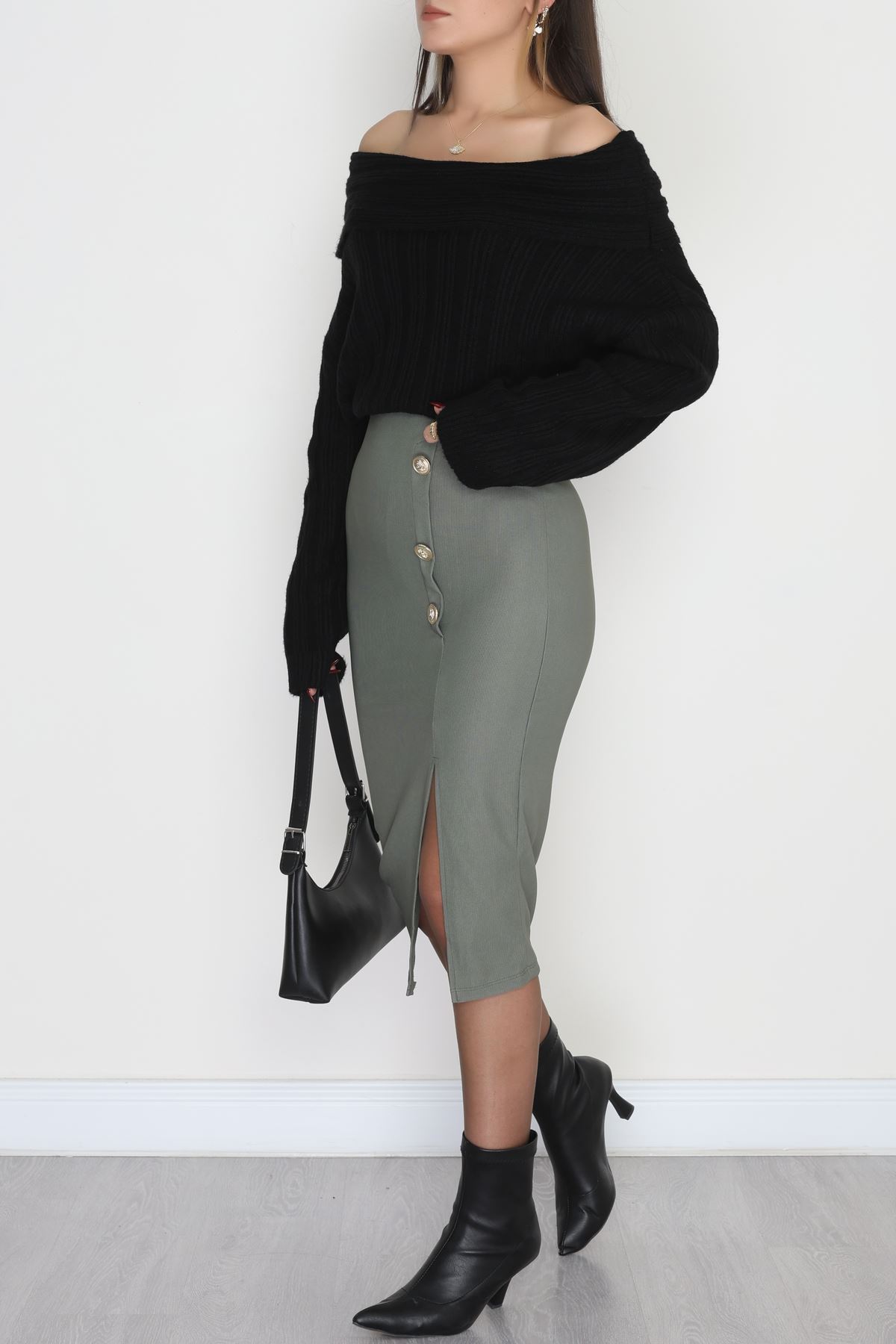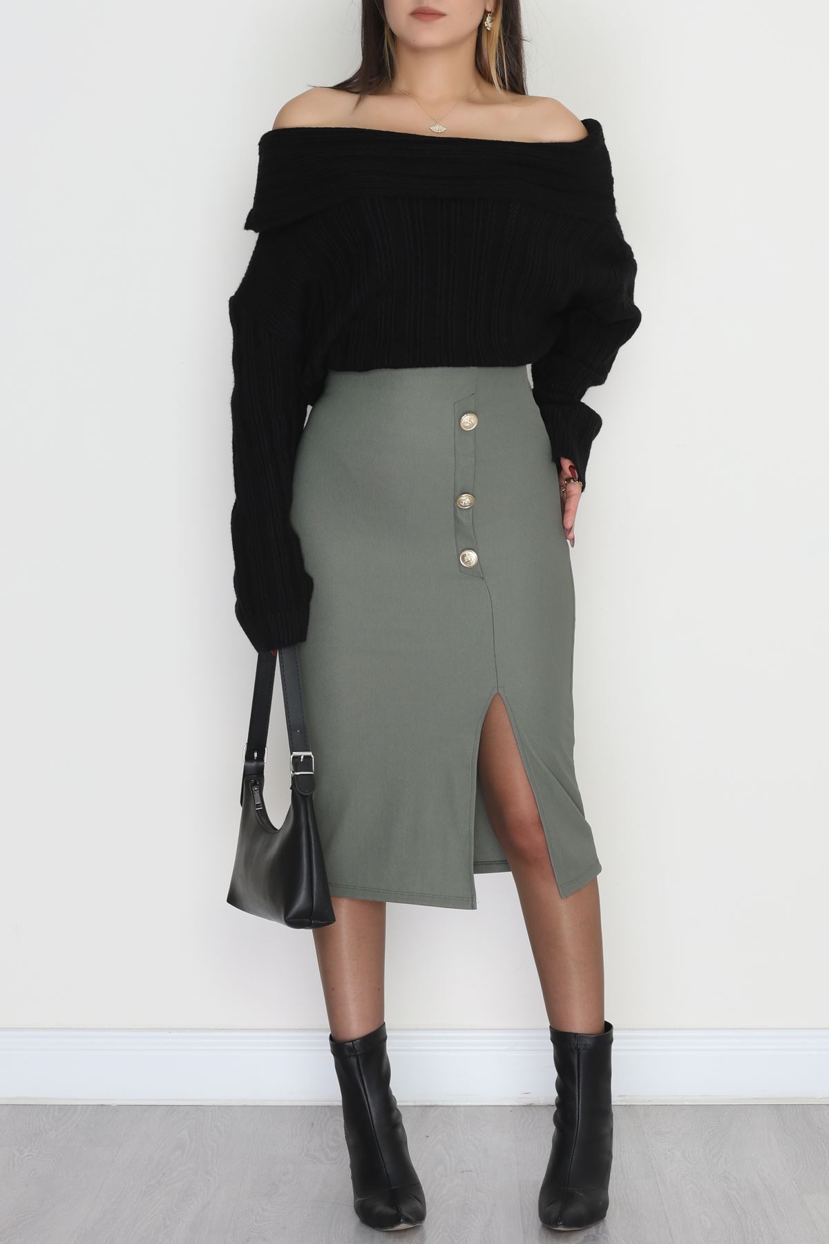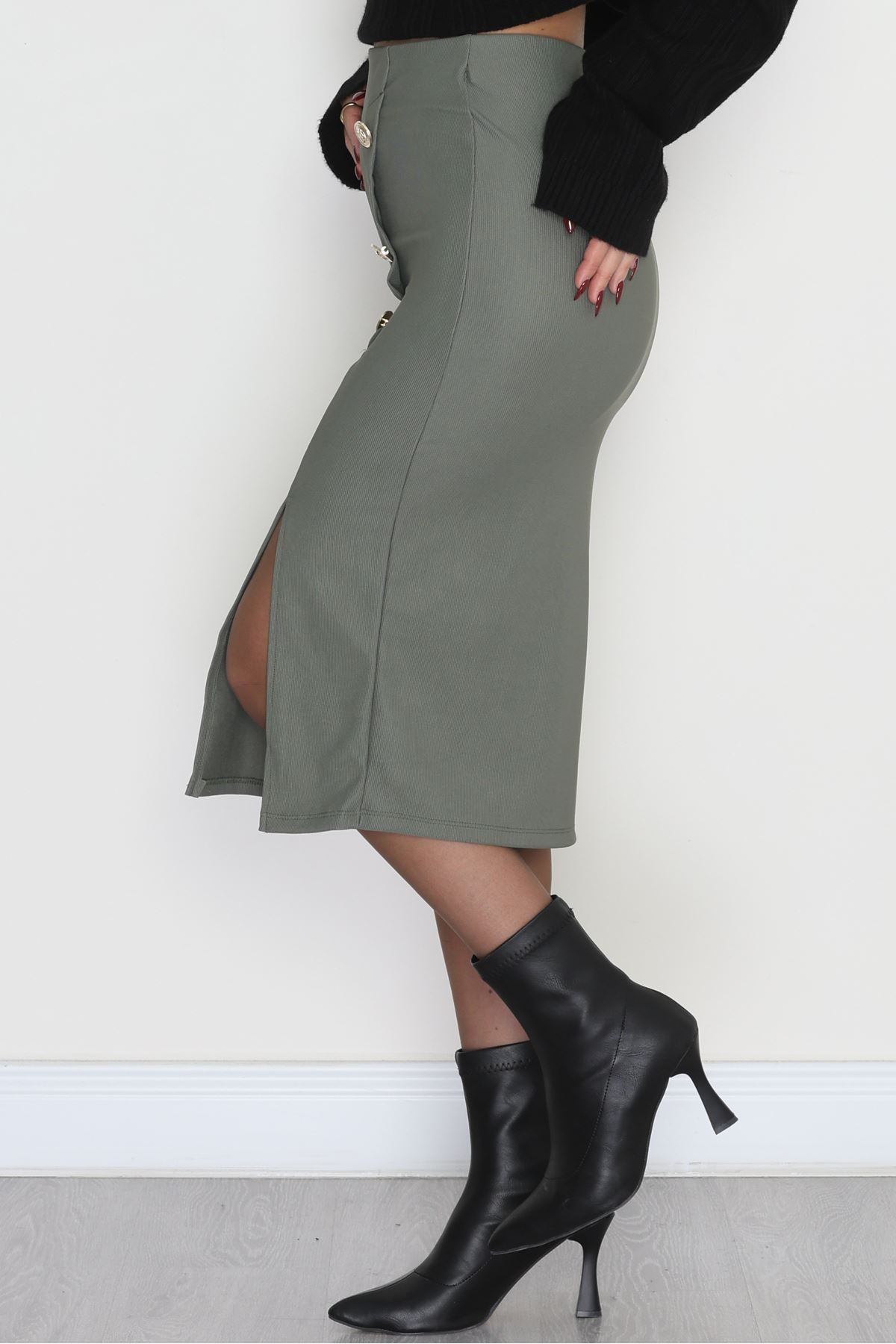 Ottoman Kumaş Düğme Detaylı Kalem Etek Haki - 51046.1223.