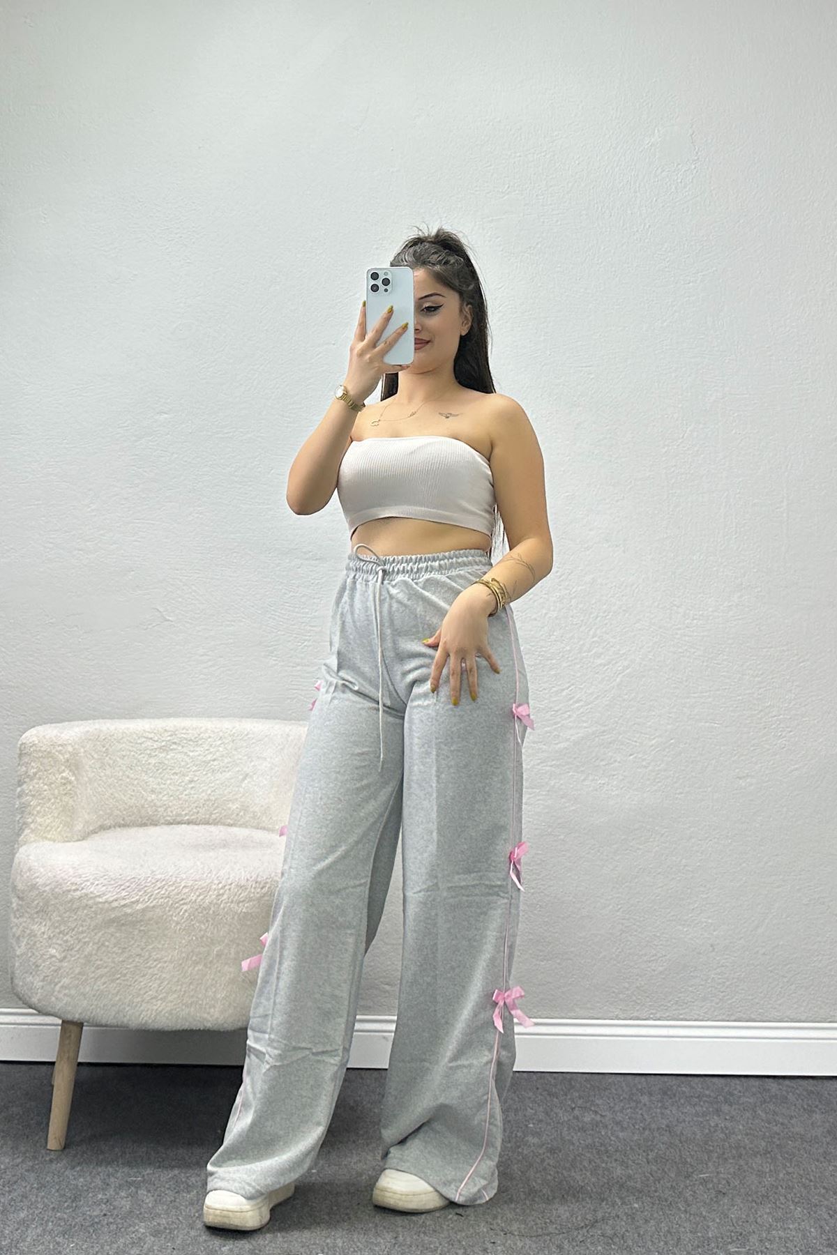 Özel Tasarım Biyeli Kurdeleli İki İplik Eşofman Altı Gri - 70192.1857.
