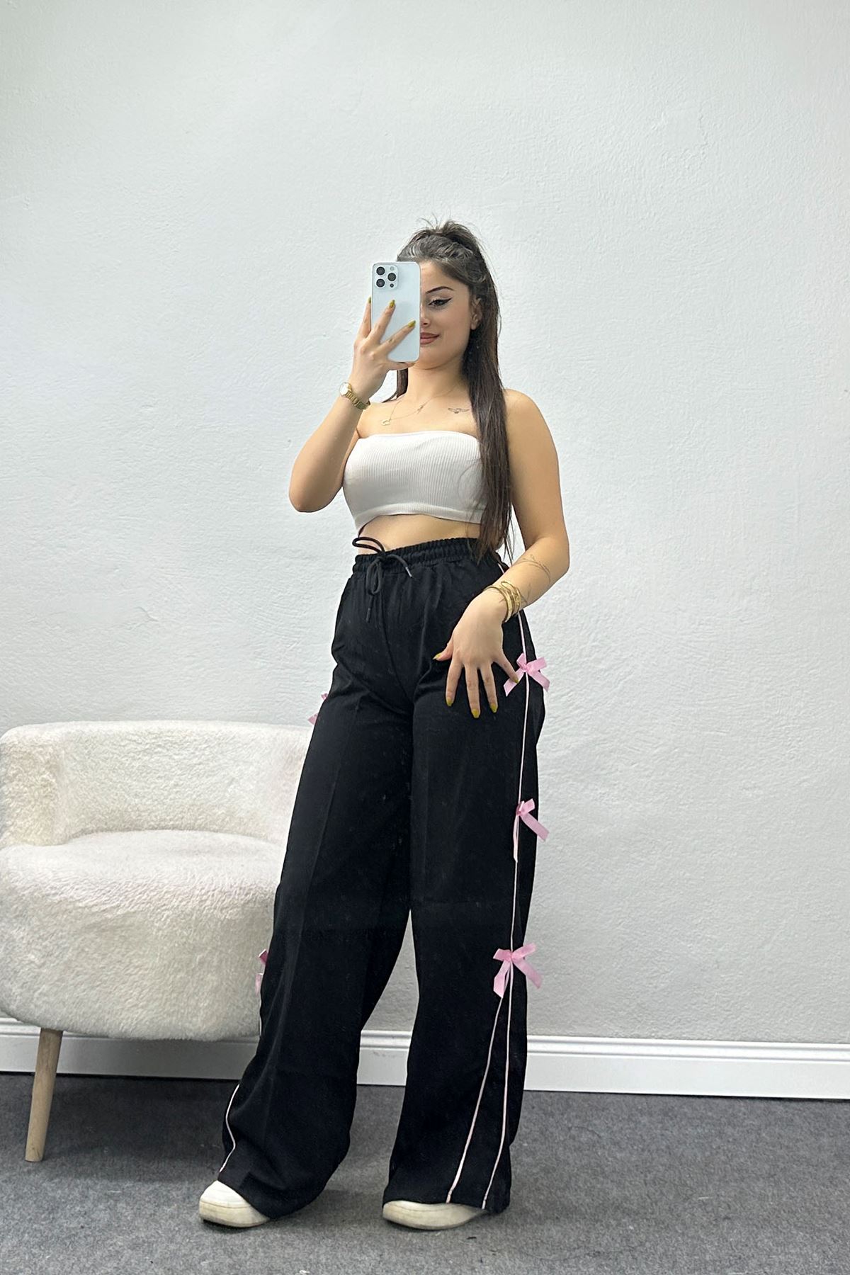 Özel Tasarım Biyeli Kurdeleli İki İplik Eşofman Altı Siyah - 70192.1857.