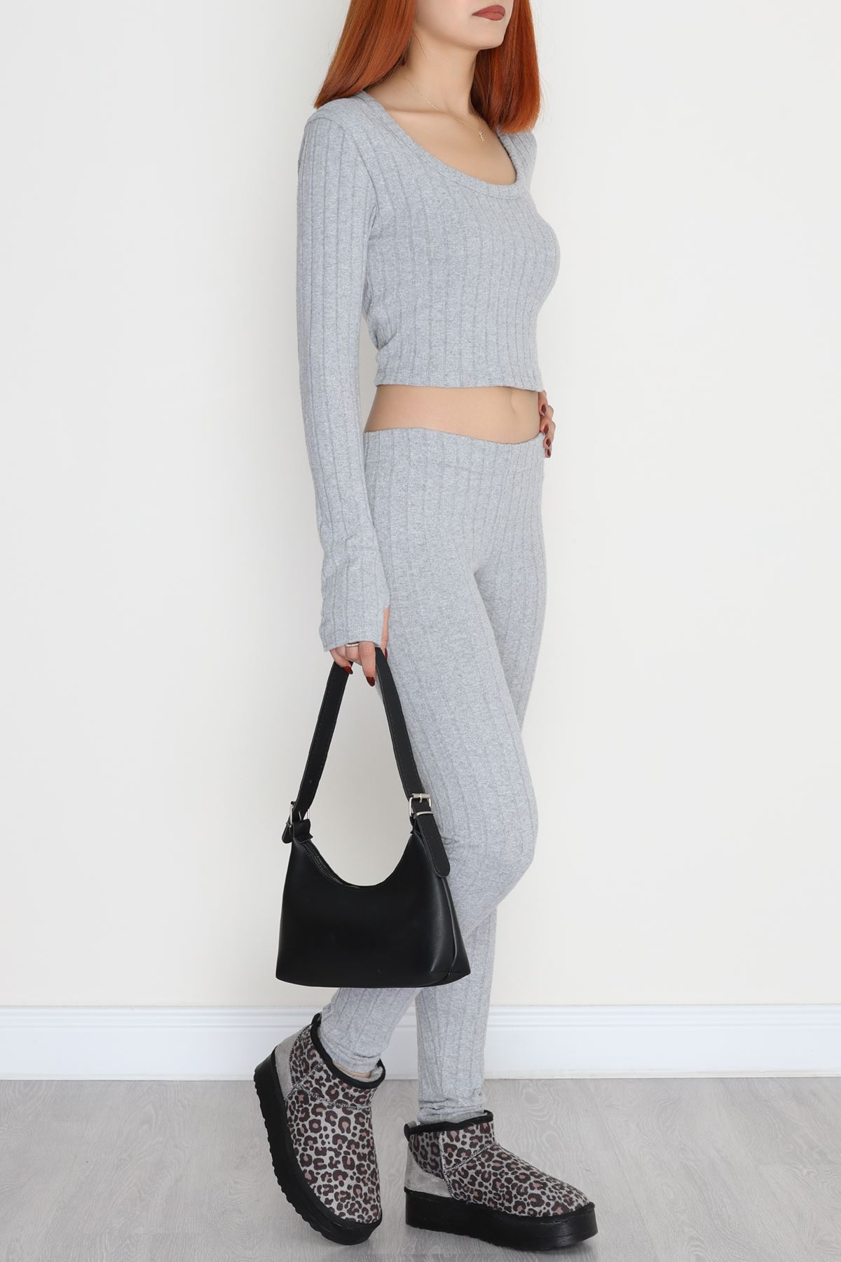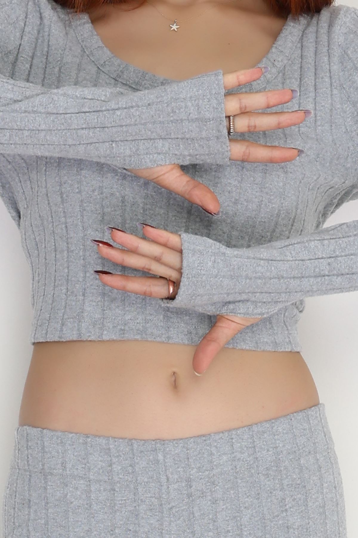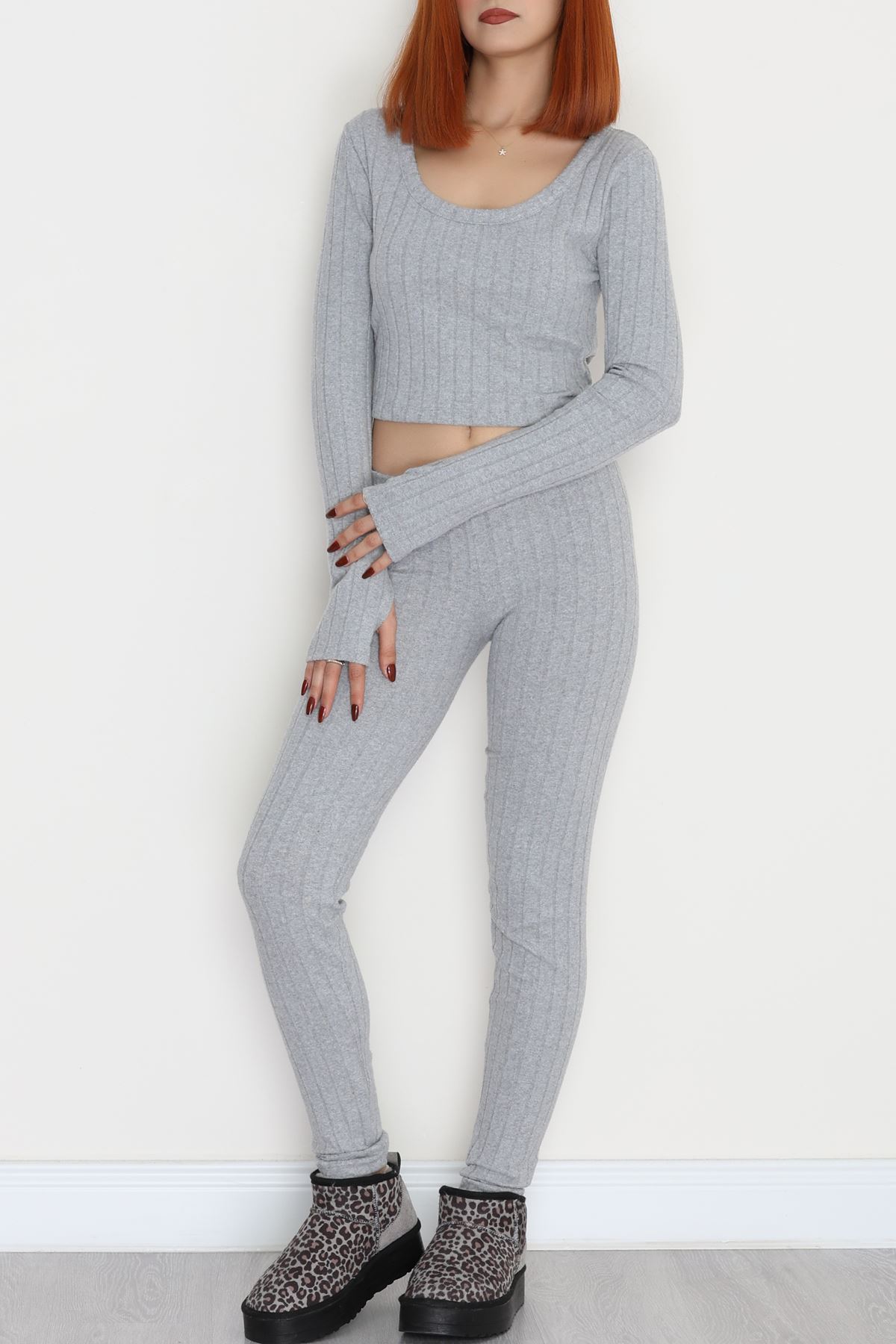Parmak Geçmeli U Yaka Raporlu İnterlok Takım Gri - 90975.1748.