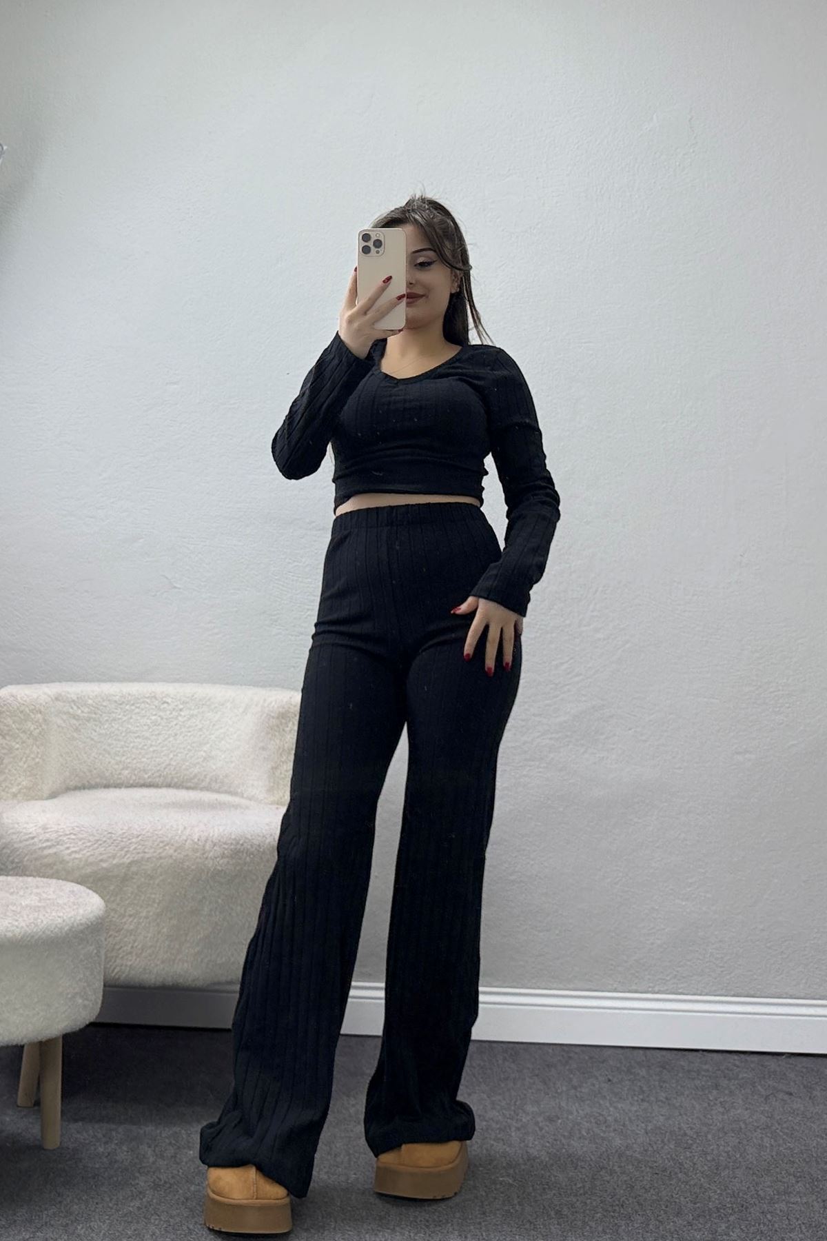 Parmak Geçmeli V Yaka İspanyol Pantolon Crop Takım Siyah - 90960.1748.