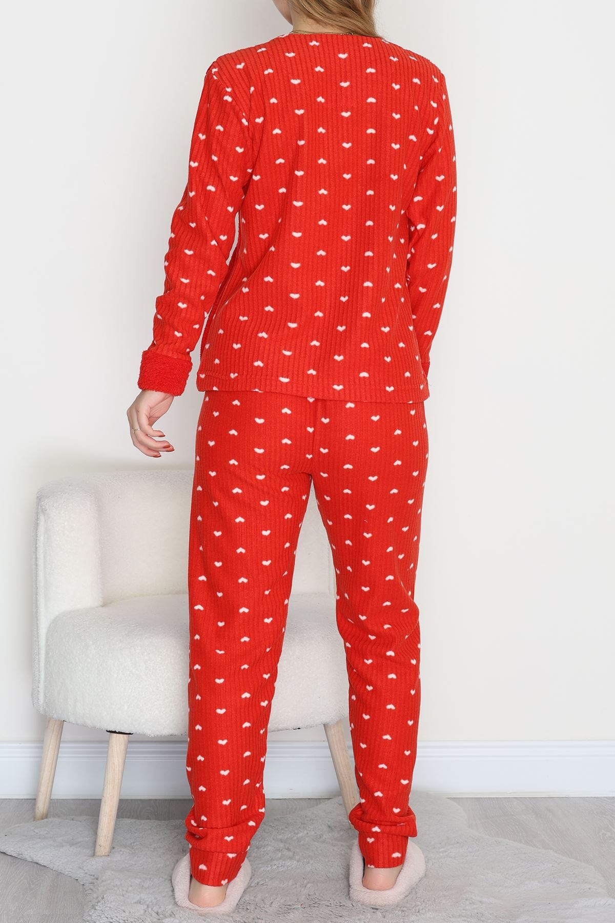 Likralı Fransız Kadife Düğmeli Pijama Takımı Kırmızı - 42069.1049.