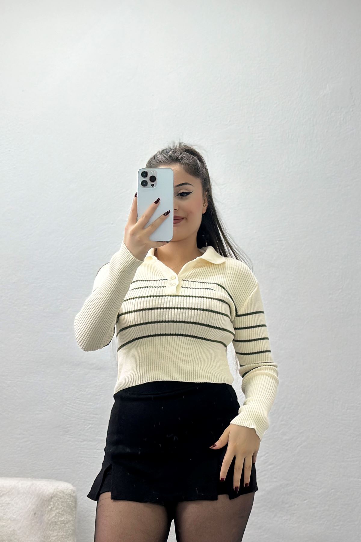 Polo Yaka Çizgili Triko Ekruhaki - 4002.2043.