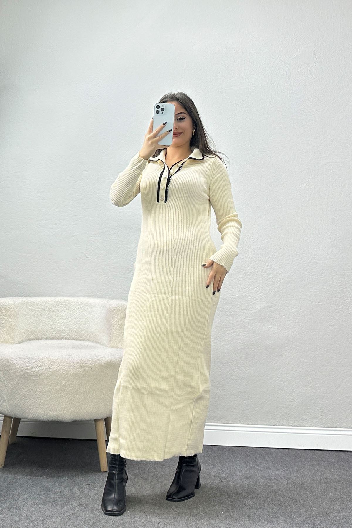 Polo Yaka Düğmeli Triko Elbise Taş - 70809.1765.