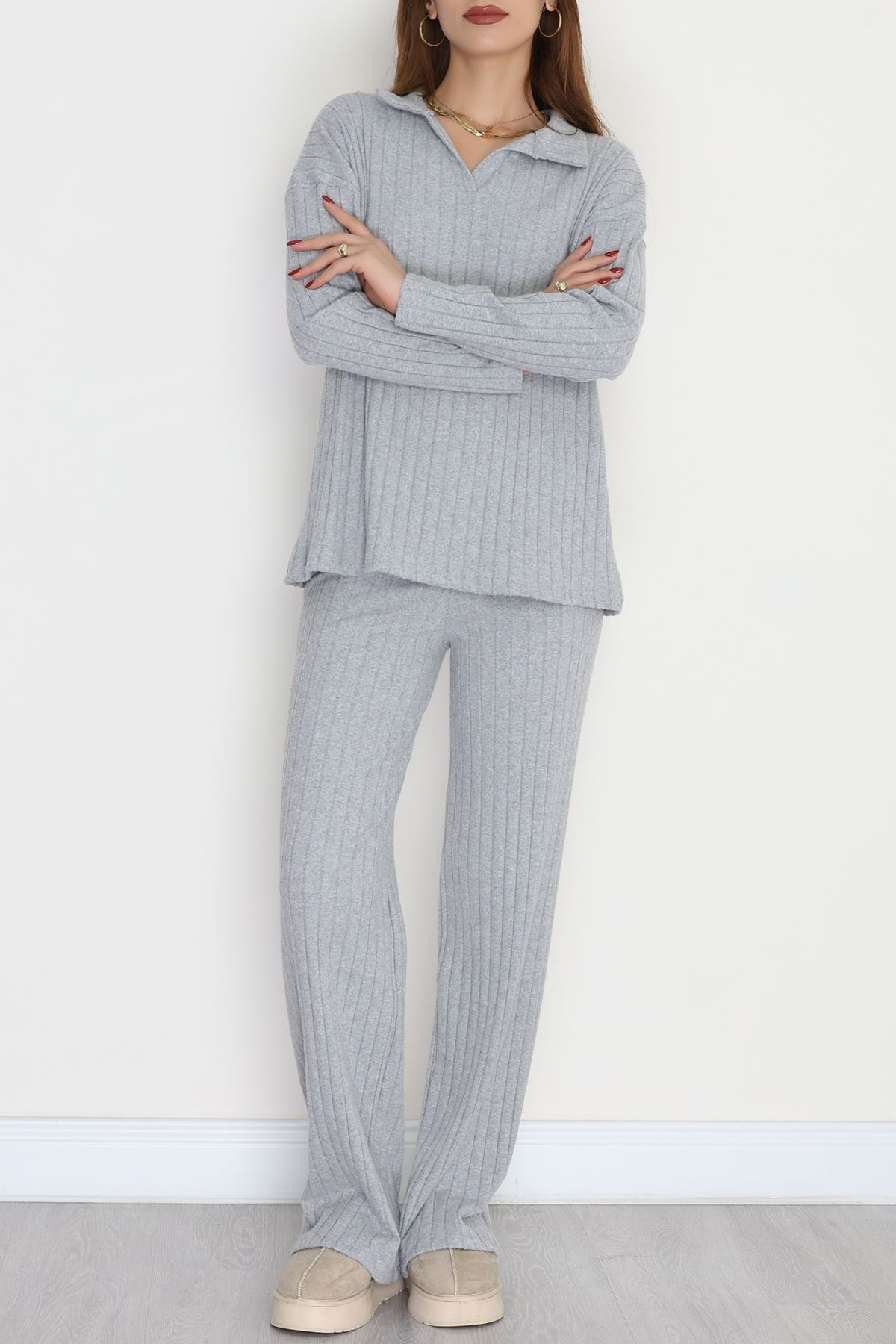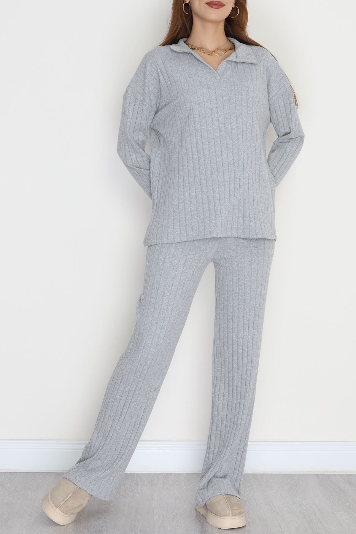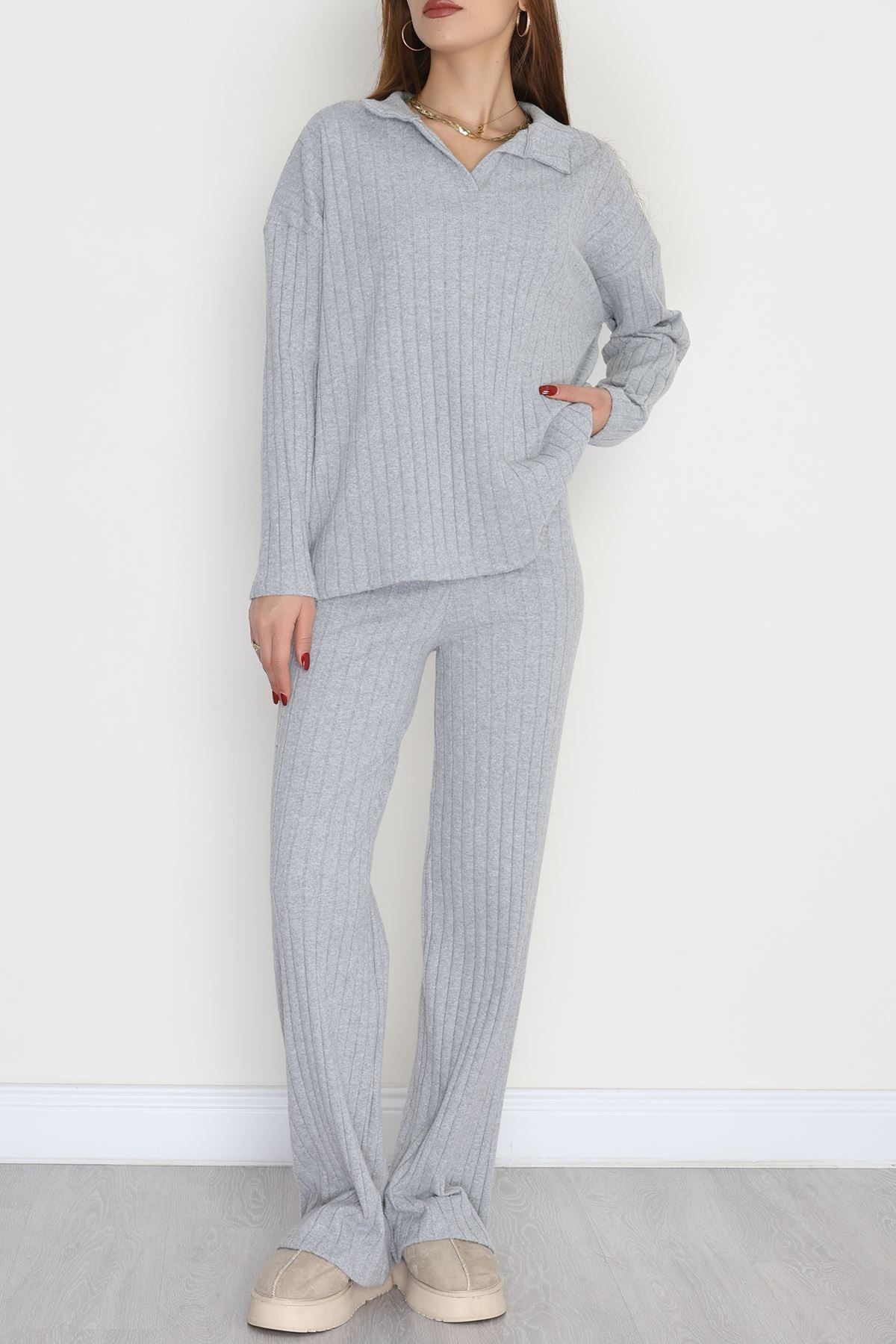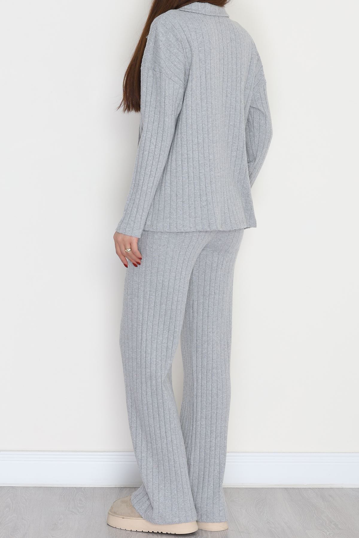 Polo Yaka Likralı İnterlok Fitilli Takım Gri - 90970.1748.
