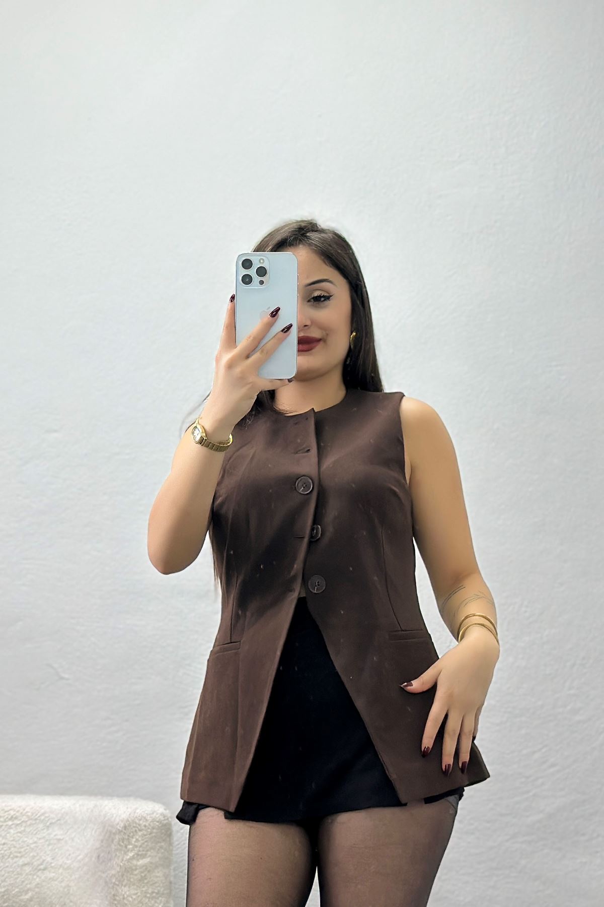 Quzu Düğmeli V Kesim Kolsuz Yelek Kahve - 90171.2002.