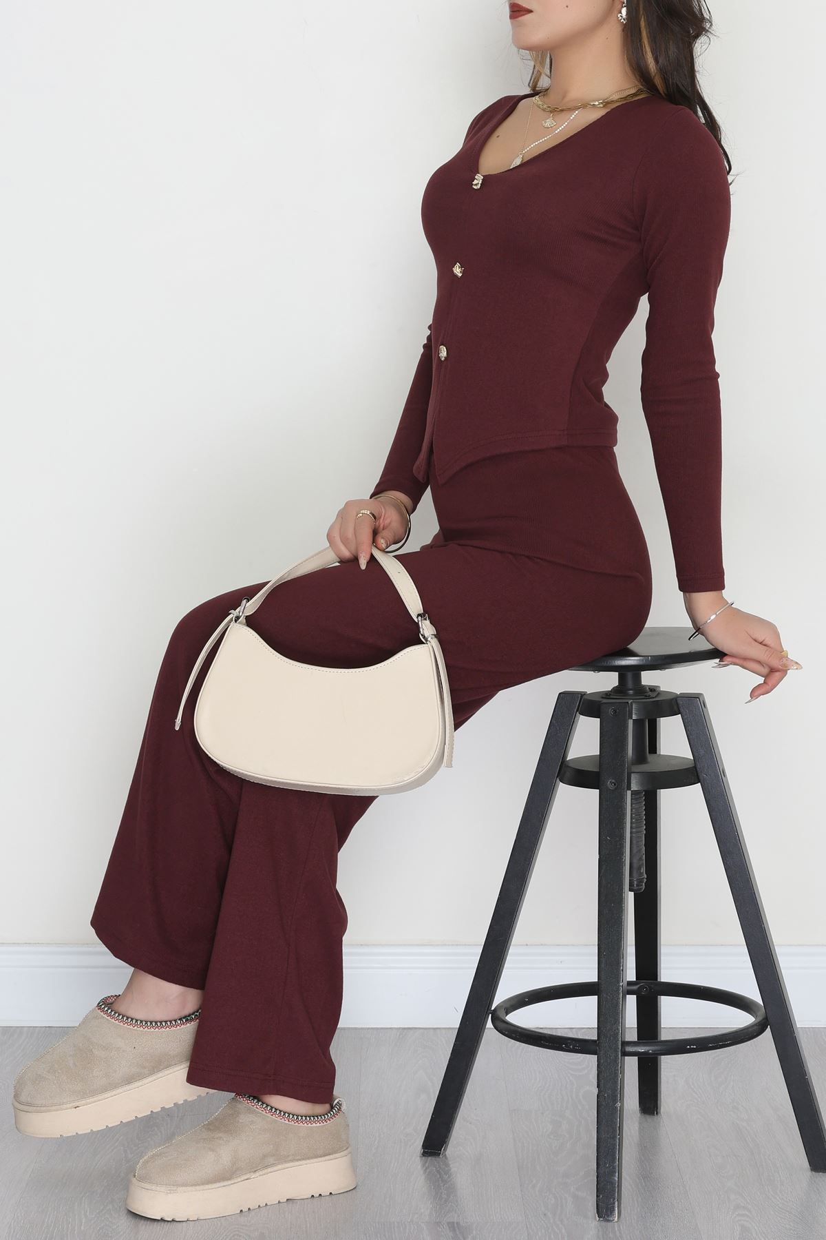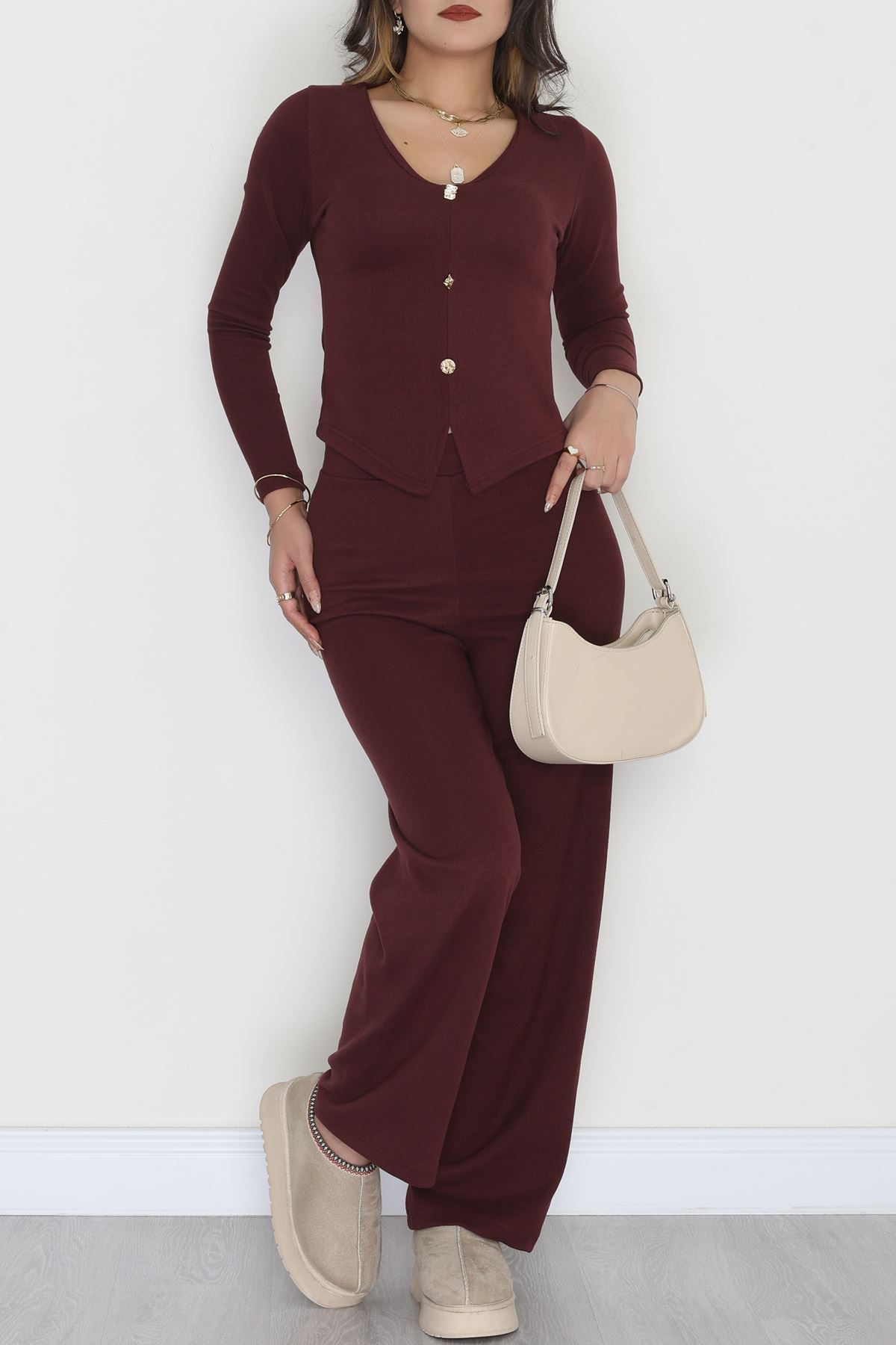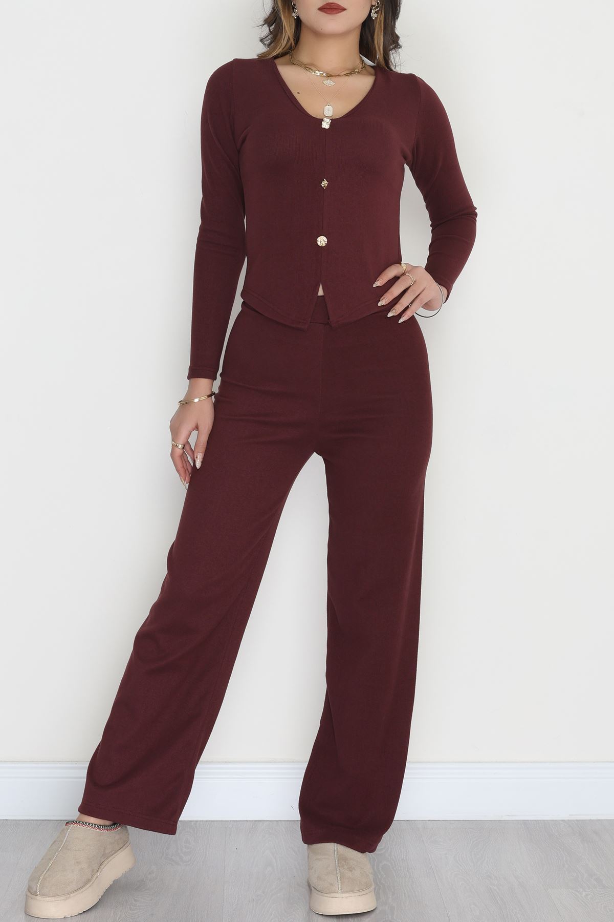 Parmak Geçmeli Yarım Dik Yaka Likralı Raporlu İnterlok Takım Bordo - 90968.1748.