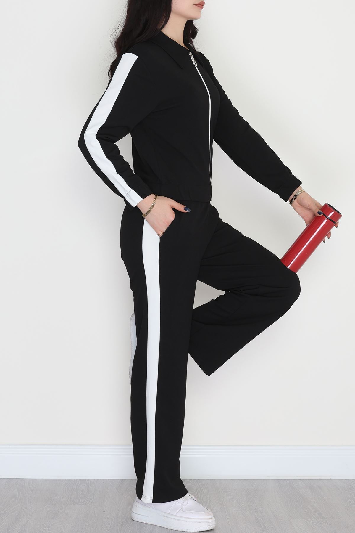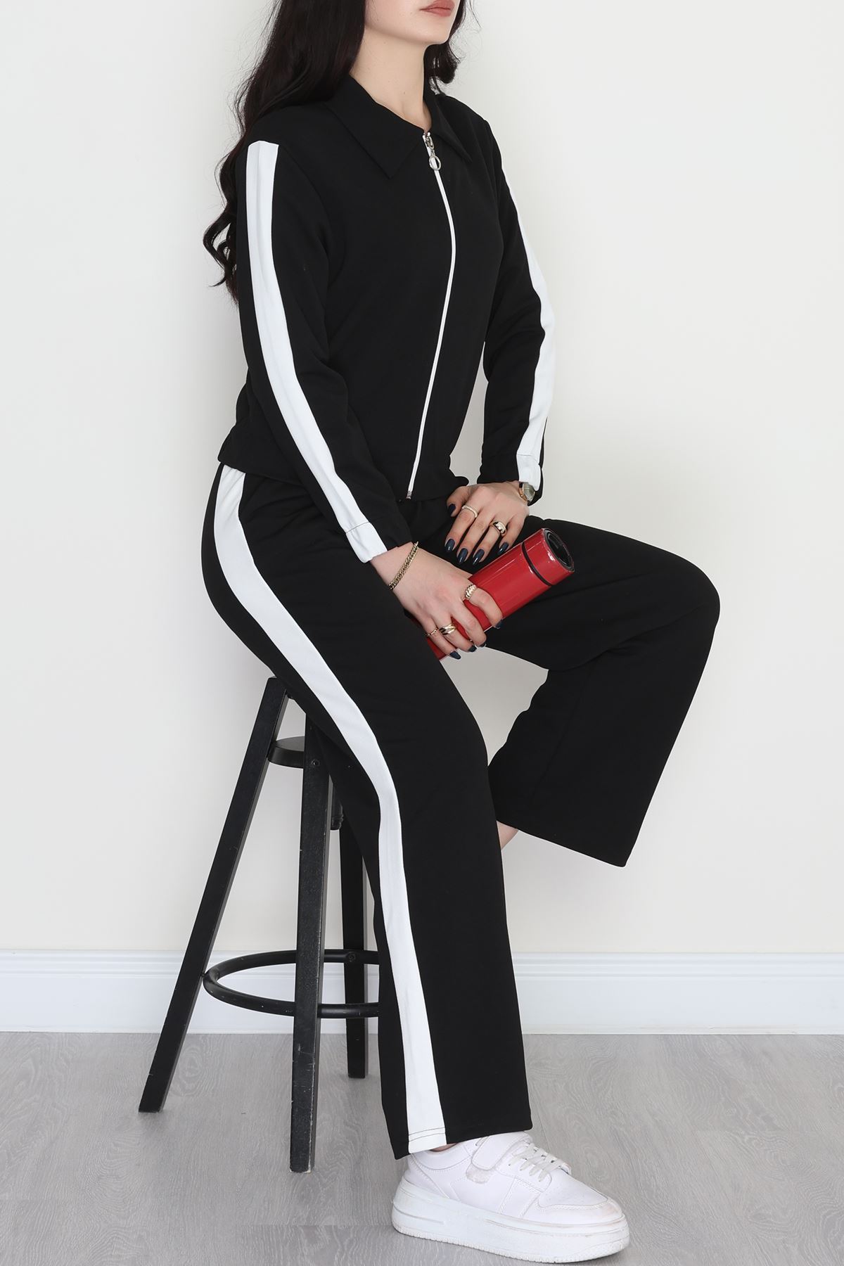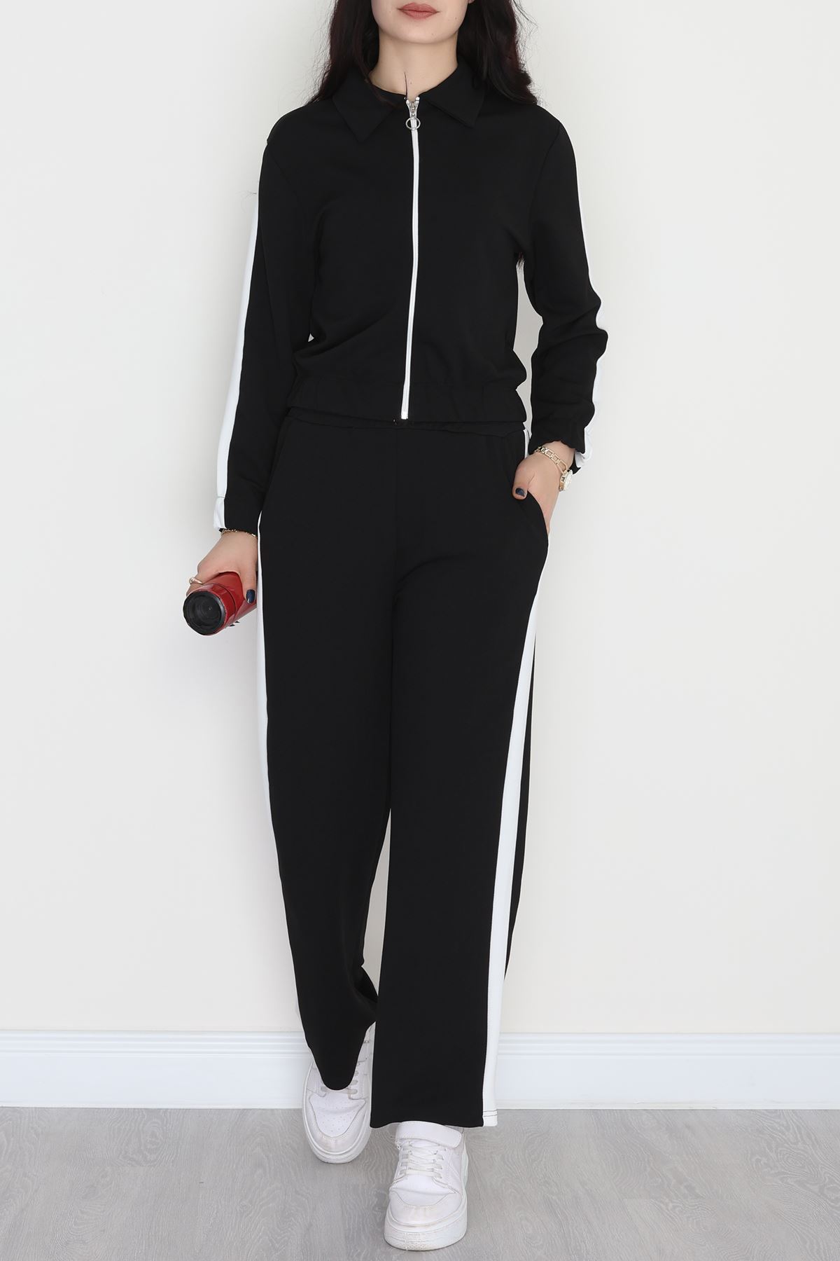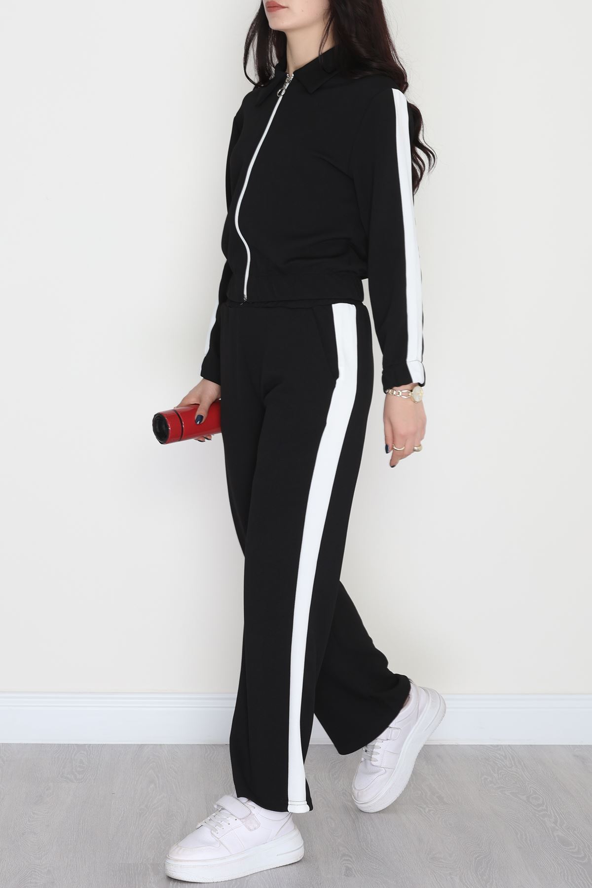 Şerit Detaylı Zra Krep Kumaş İkili Takım Siyahbeyaz - 31442.1837.