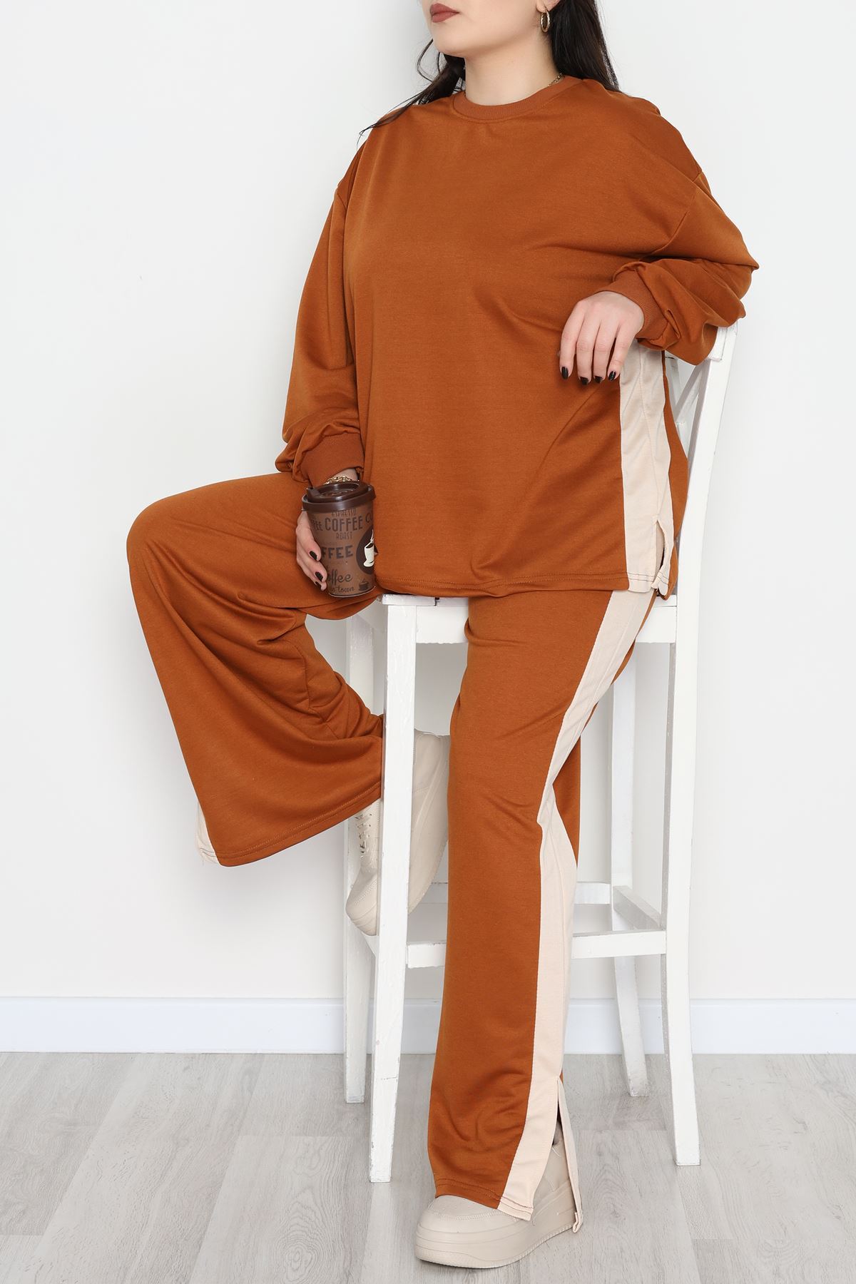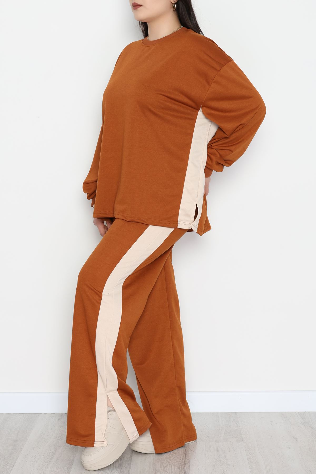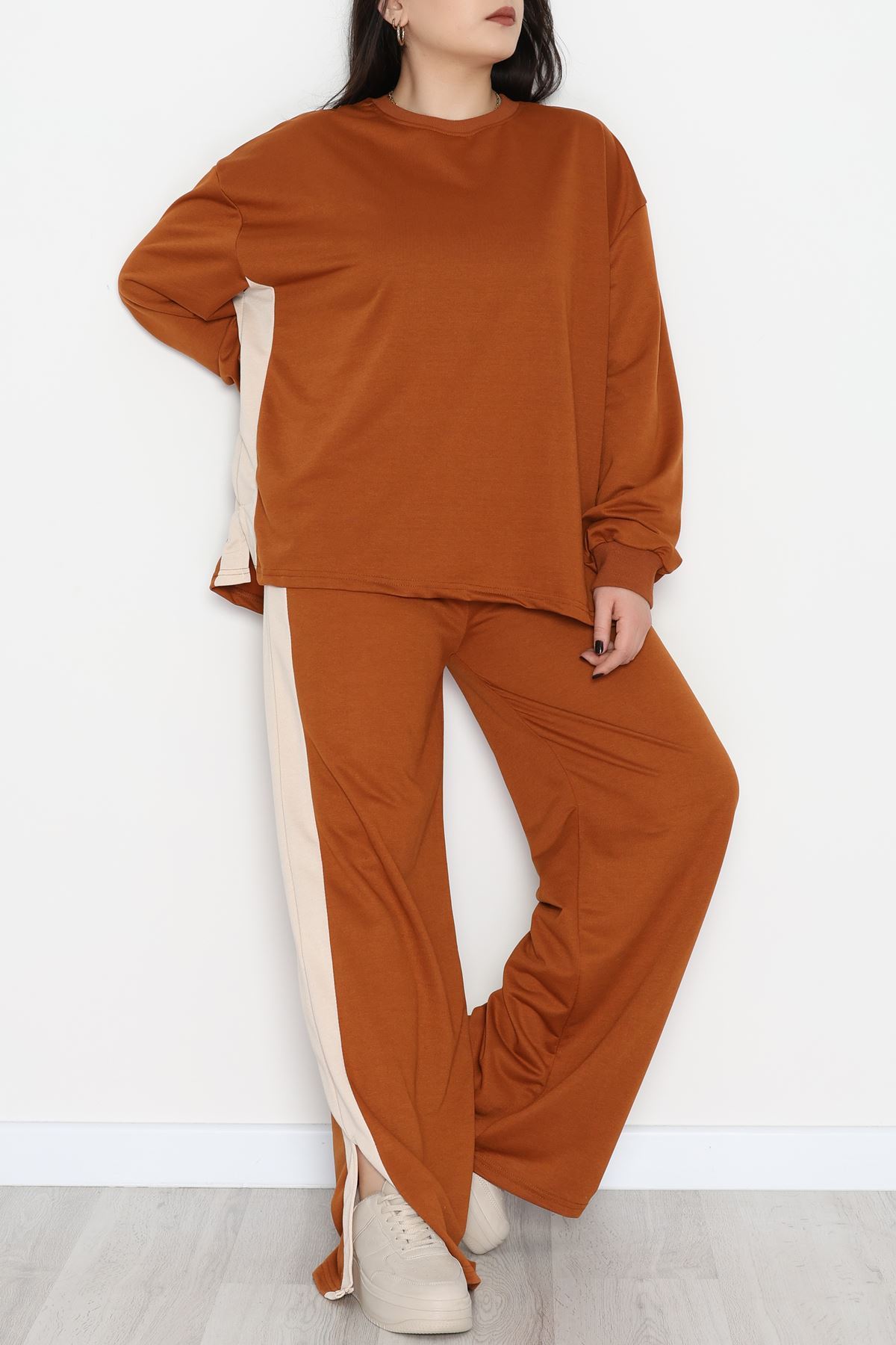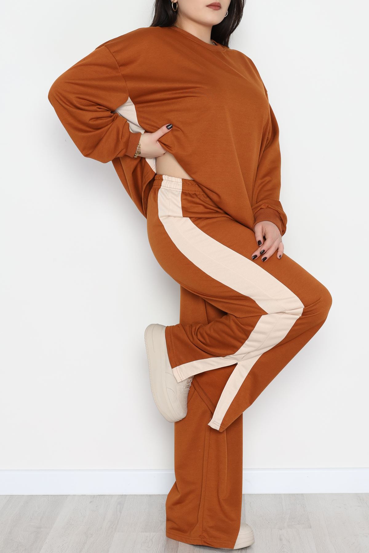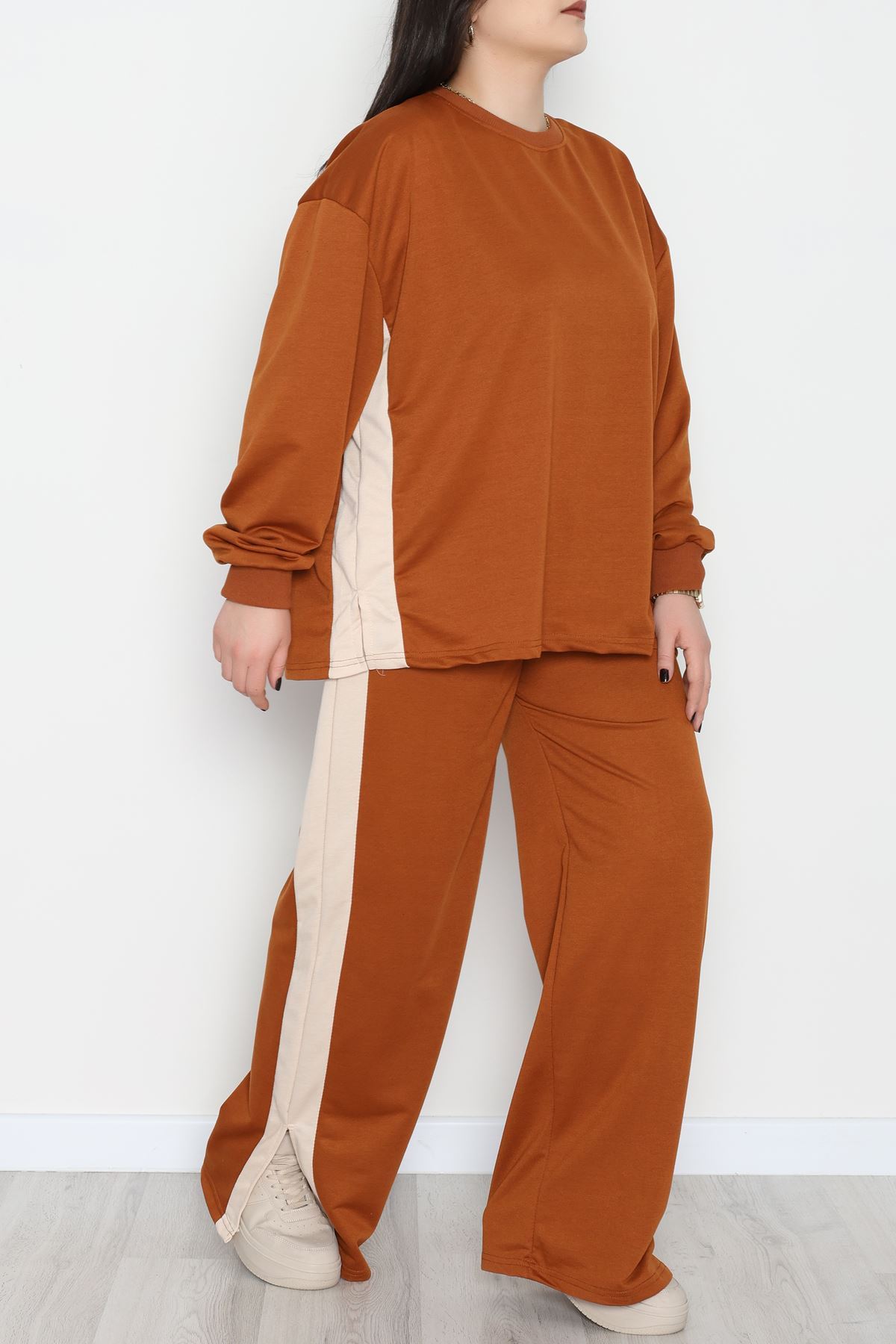 Şeritli 2 İplik Büyük Beden Eşofman Takımı Kahvebej - 52047.1857.