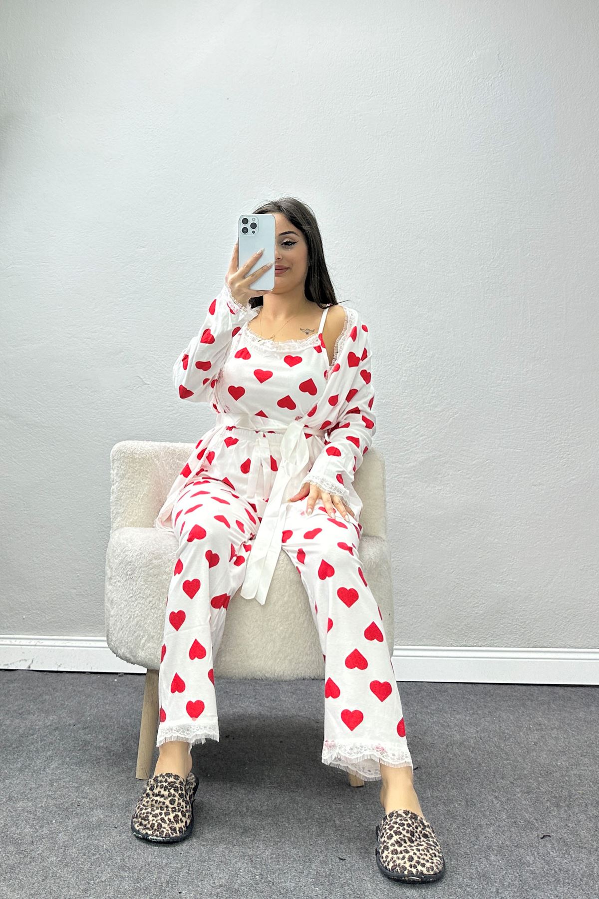 Süet 3'Lü Pijama Set Beyazkırmızı - 798.1287.
