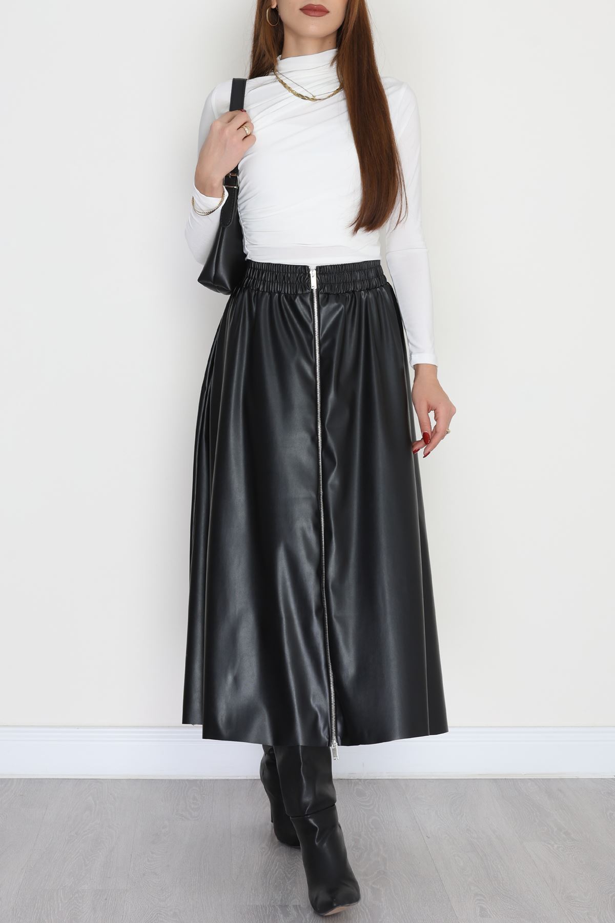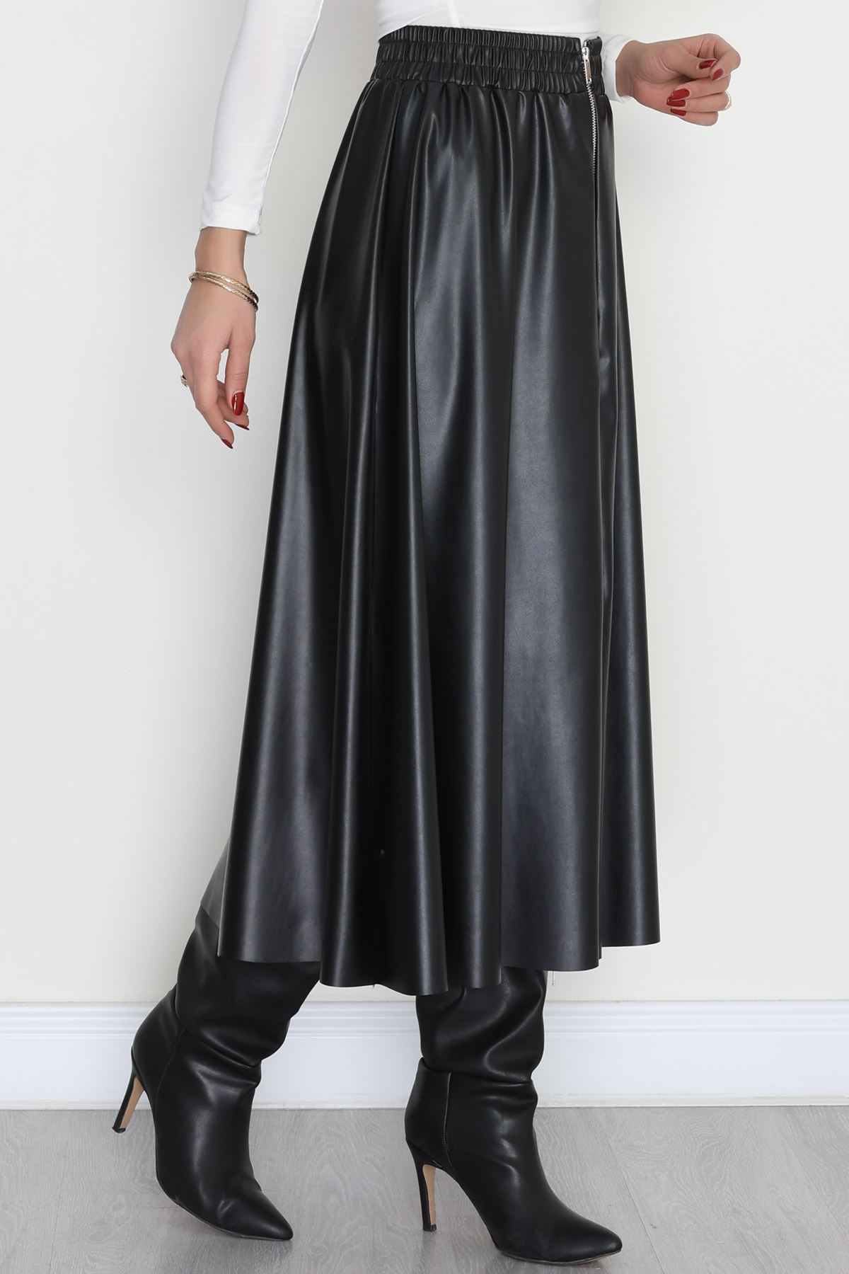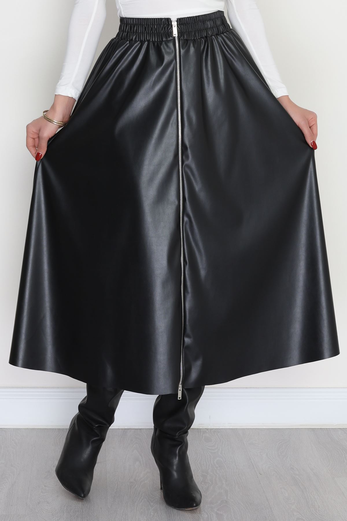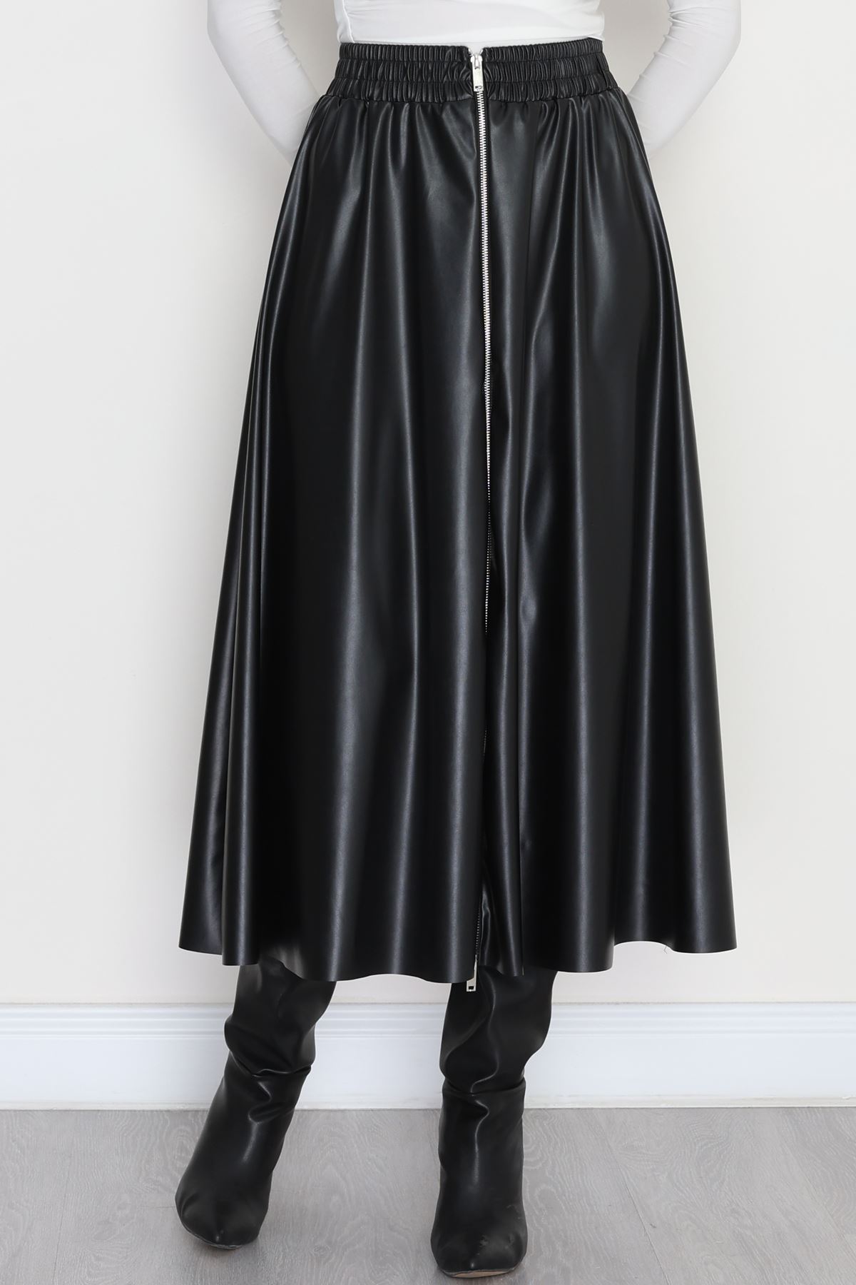 Suni Deri Önden Fermuarlı Uzun Kloş Etek Siyah - 80897.701.