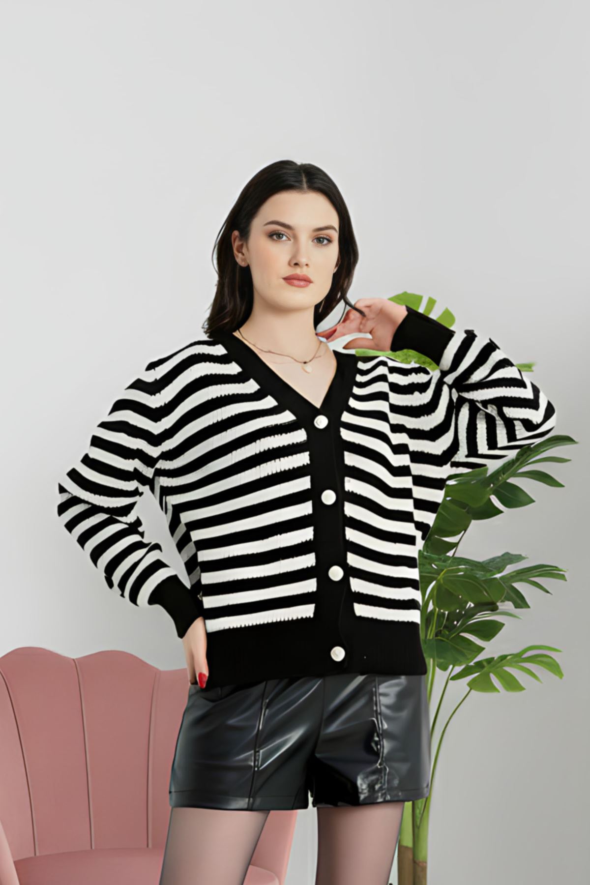 V Yaka Çizgili Hırka Siyahlatte - 4038.1577.