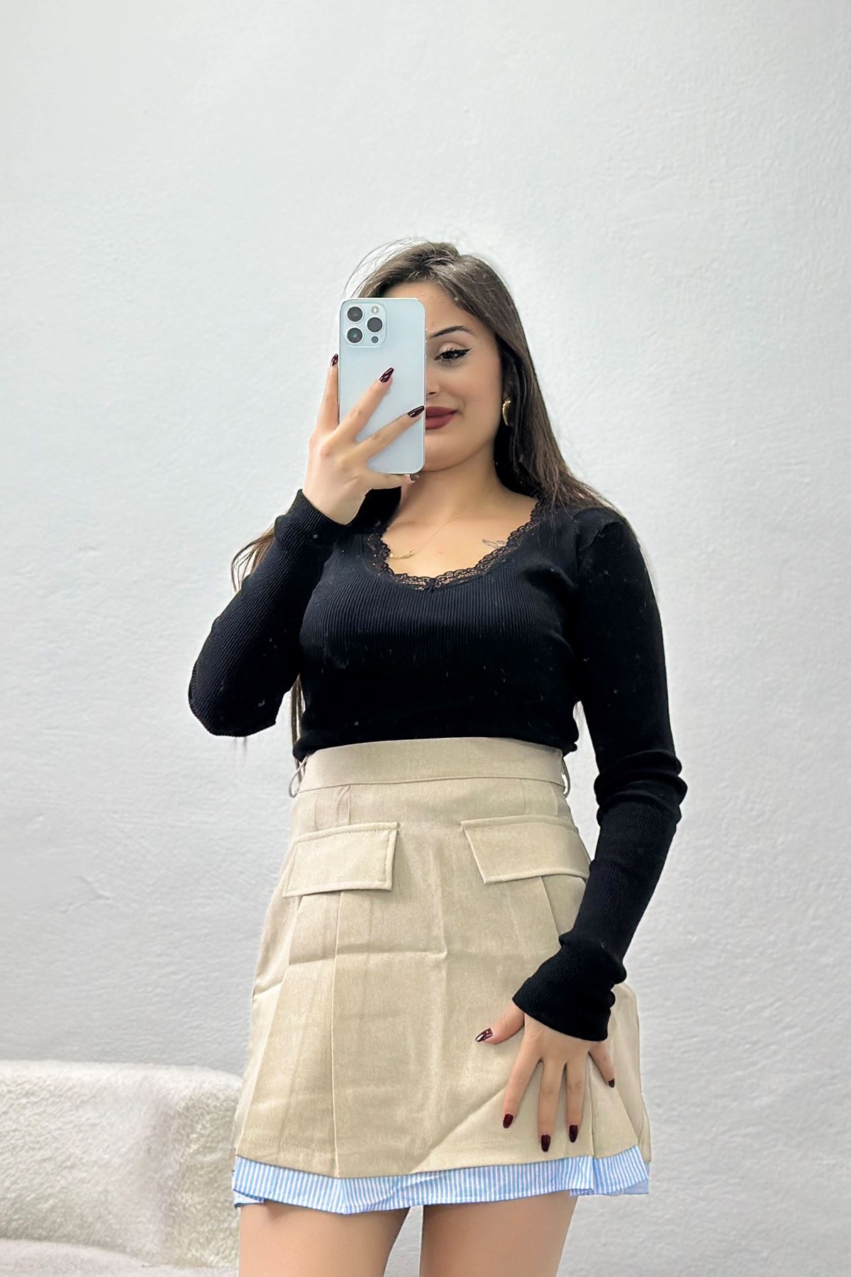 V Yaka Dantelli Kaşkorse Bluz Siyah - 1783.1095.