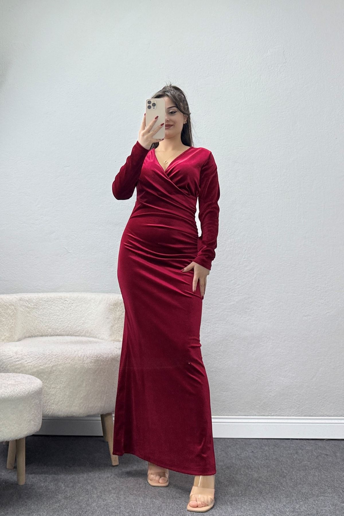 Drapeli İthal Kadife Elbise Bordo - 42583.1949.
