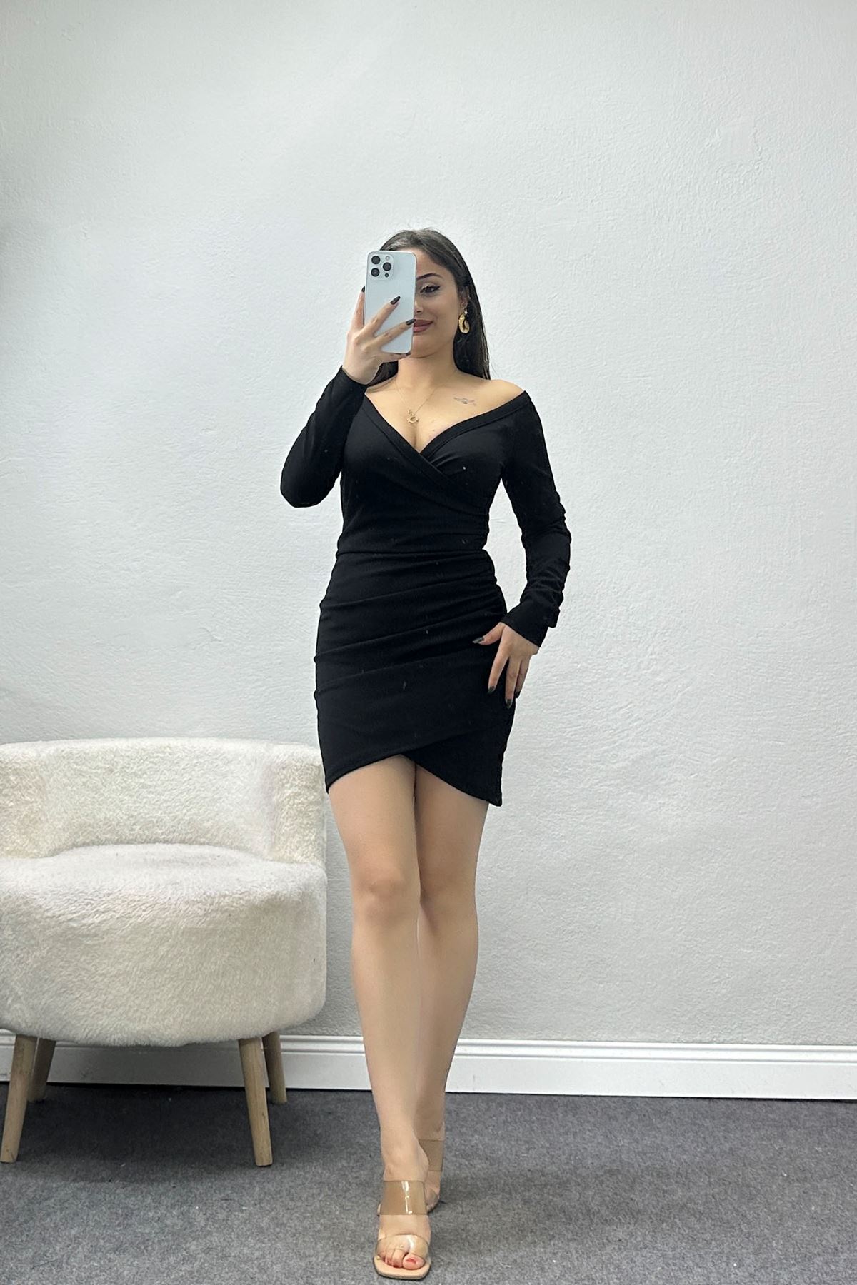 Toka Detay Dalgıç Madonna Yaka Elbise Siyah - 42548.1748.