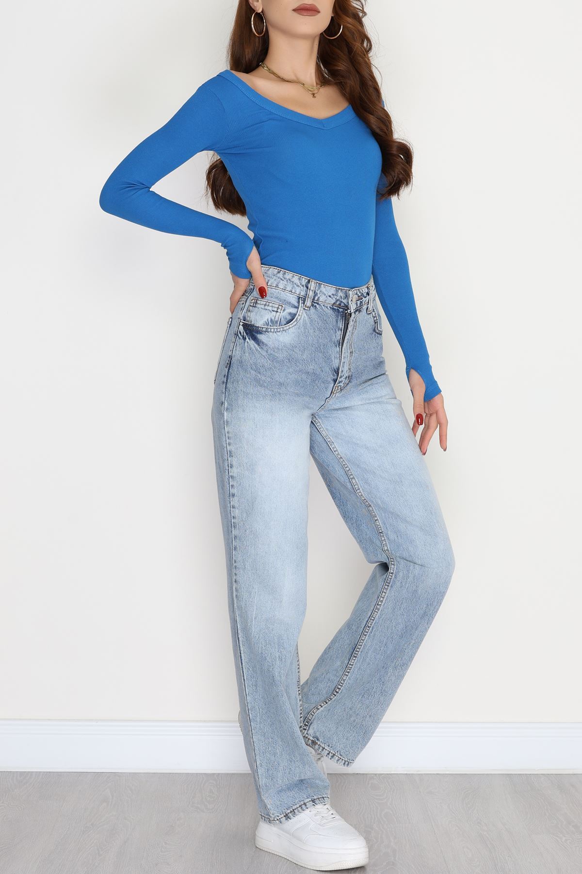 V Yaka Parmak Geçmeli Kaşkorse Body Mavi - 70787.599.