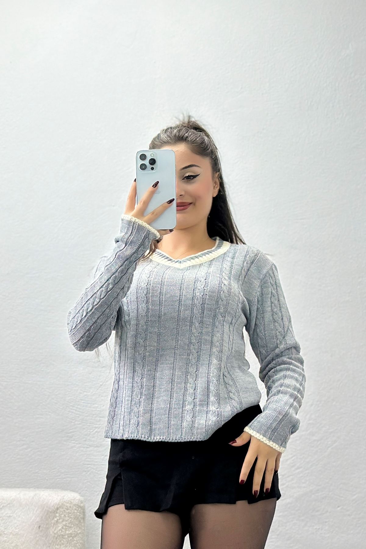 Çizgili Bisiklet Yaka Triko Fümegri - 3099.1577.