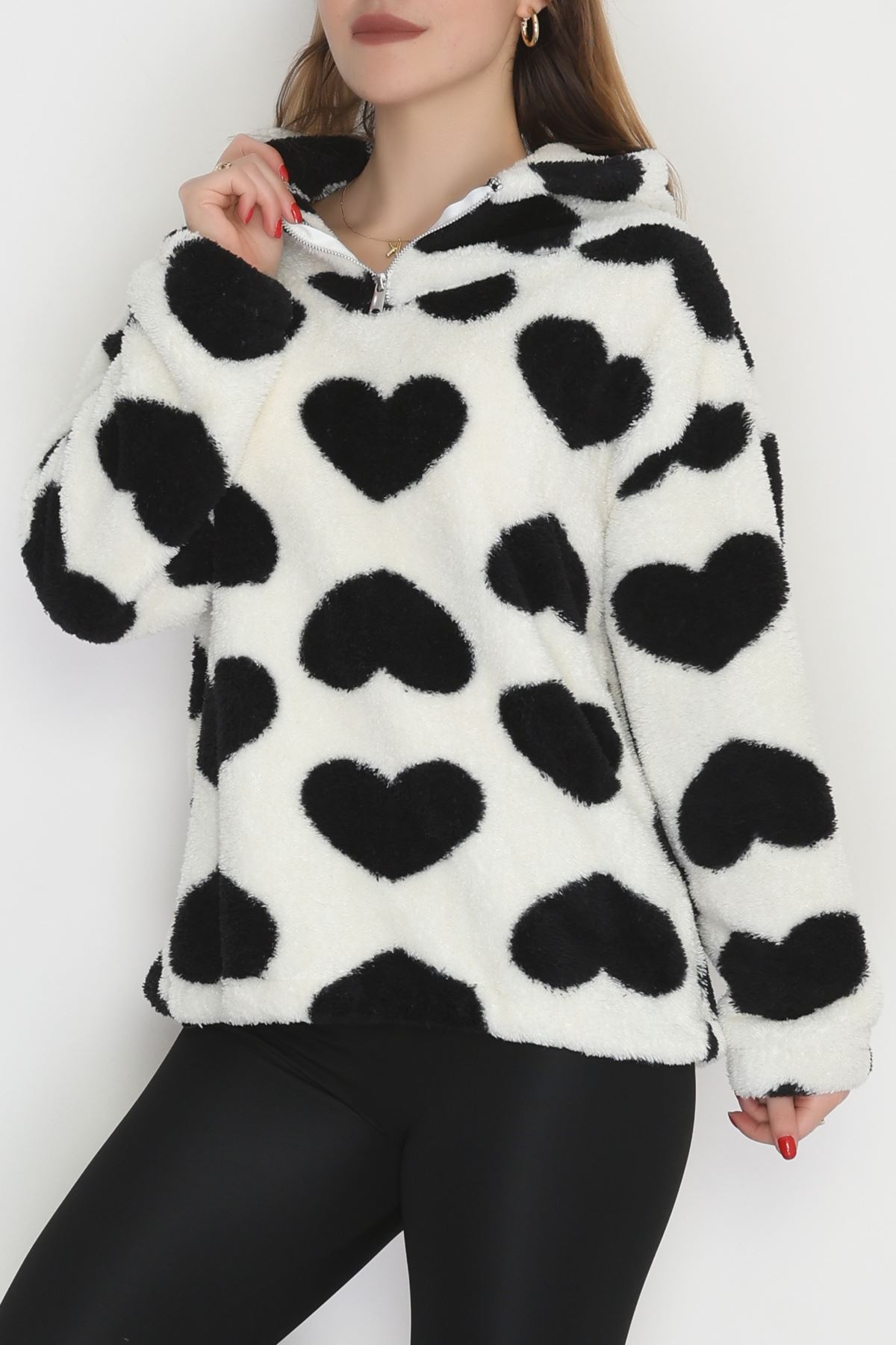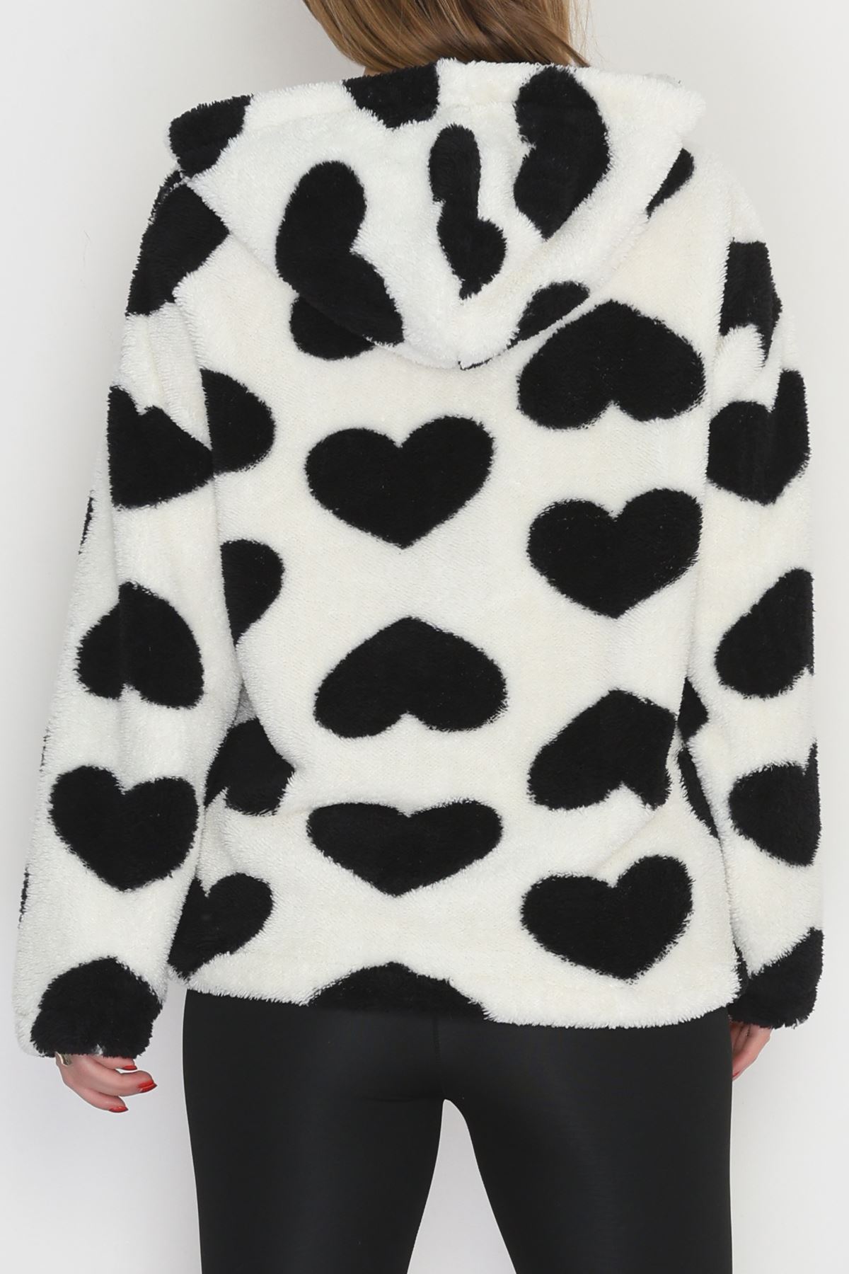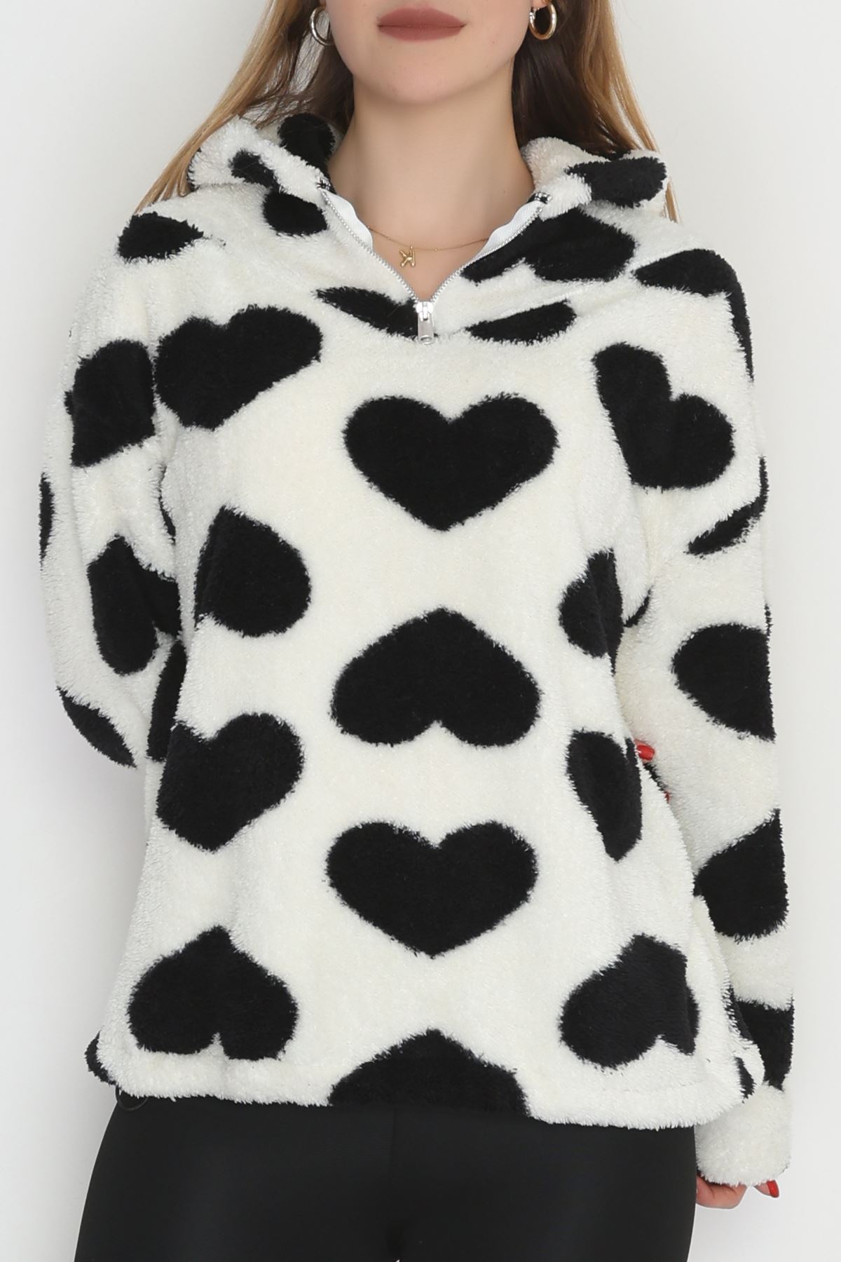 Welsoft Kumaş Kalpli Kapşonlu Fermuarlı Sweat Beyazsiyah - 31608.308.