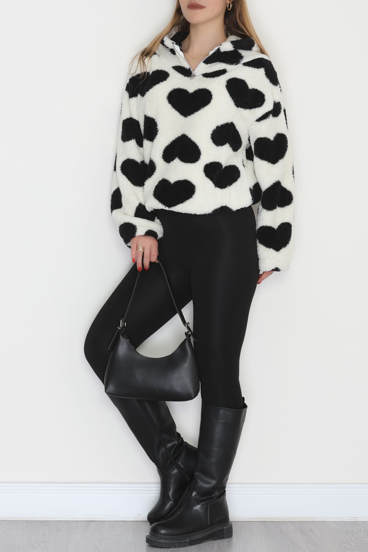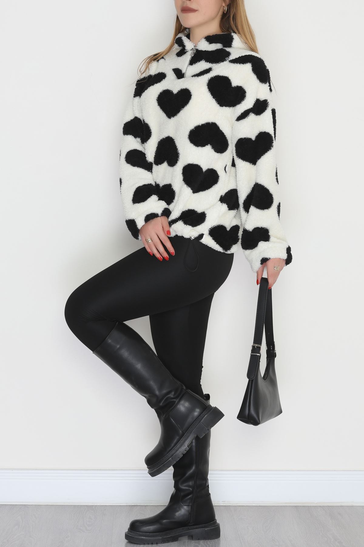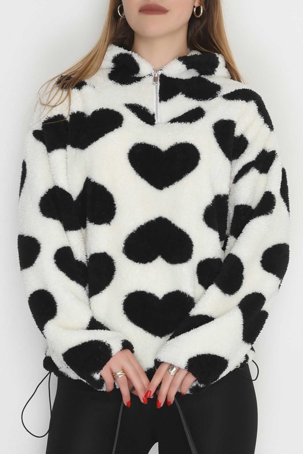 Welsoft Kumaş Kalpli Kapşonlu Fermuarlı Sweat Beyazsiyah - 31608.308.