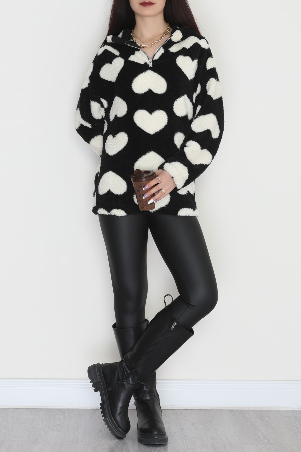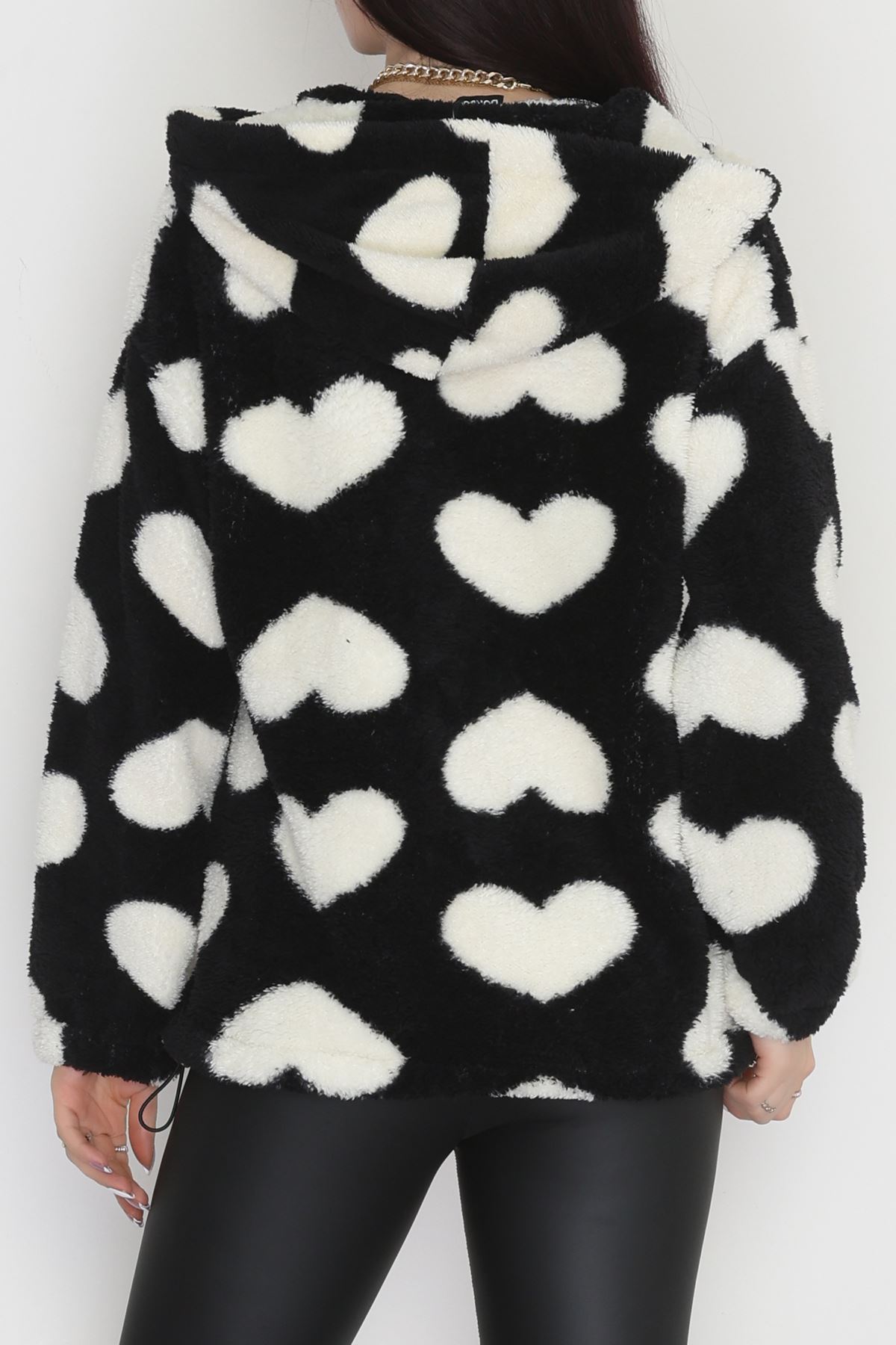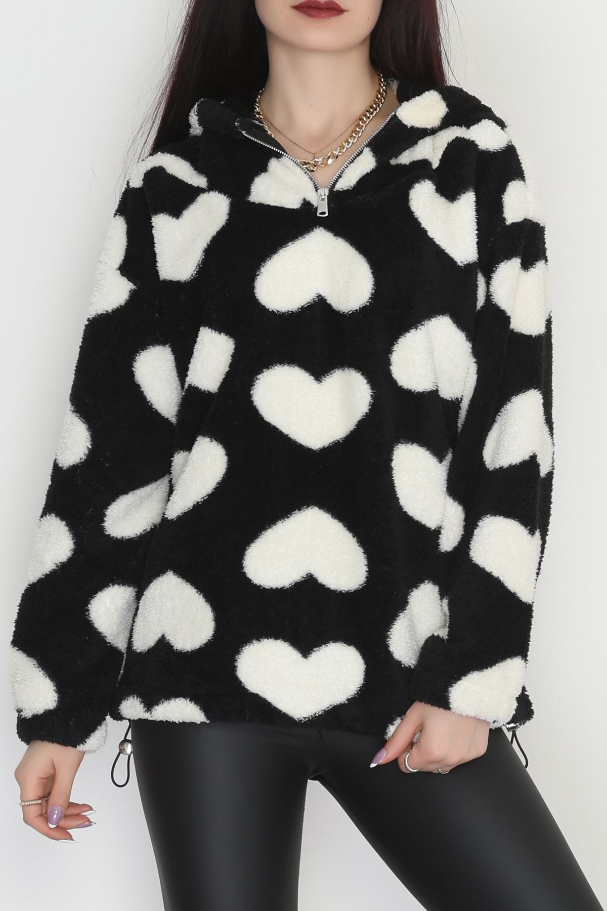 Welsoft Kumaş Kalpli Kapşonlu Fermuarlı Sweat Siyahbeyaz - 31608.308.