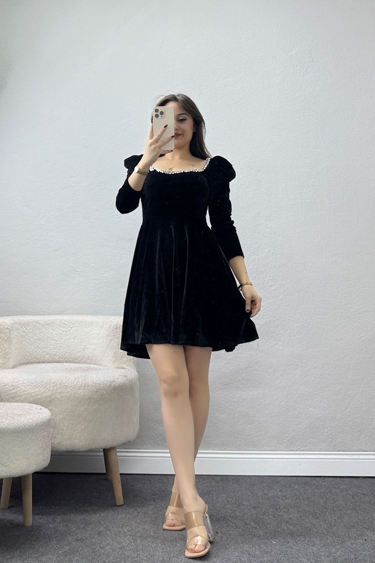 Yakası Taş Detaylı Kadife Elbise Siyah - 582342.1592.
