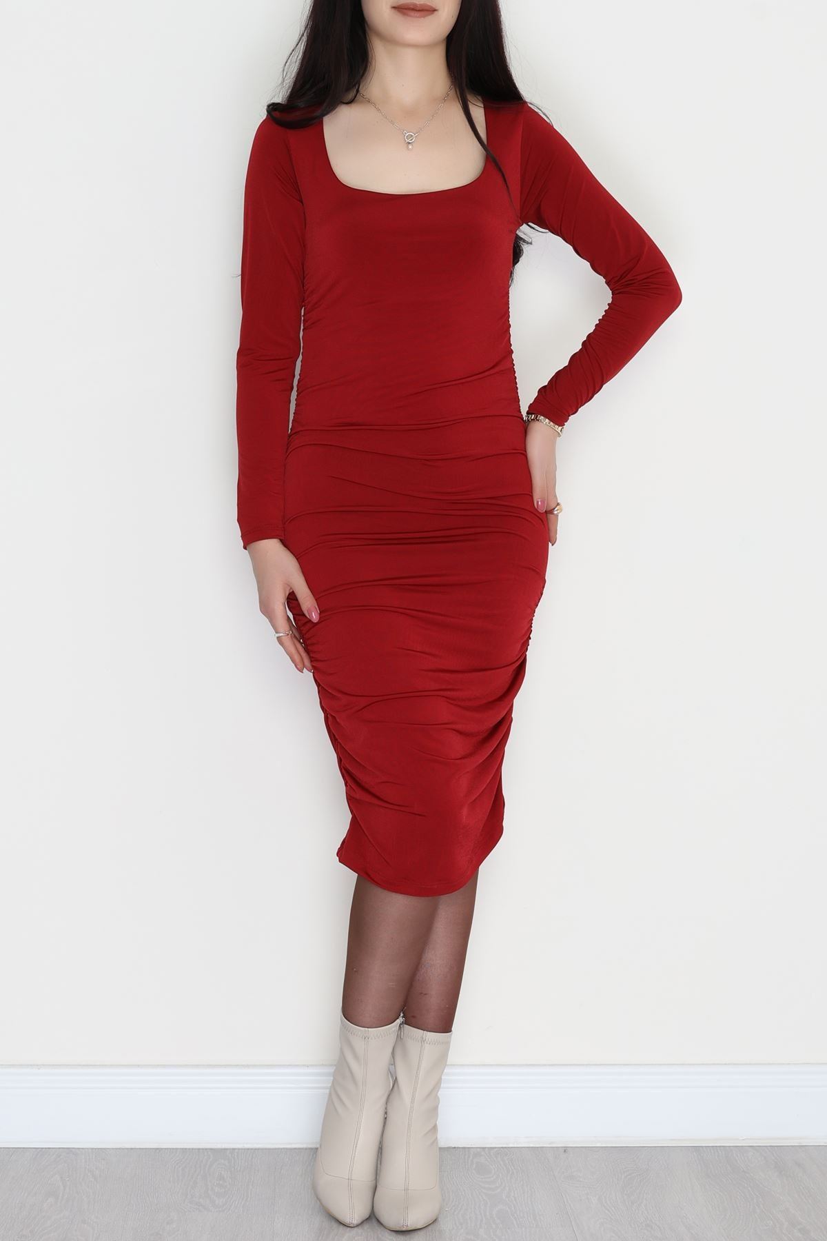Yanları Büzgülü Sandy Elbise Bordo - 42569.1949.