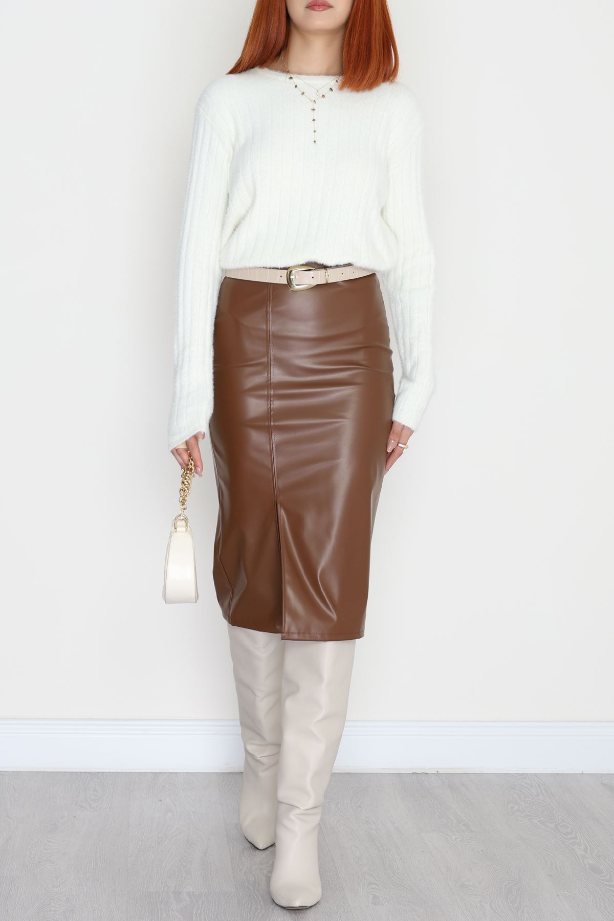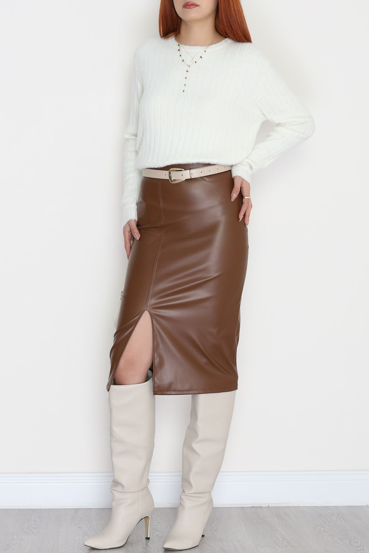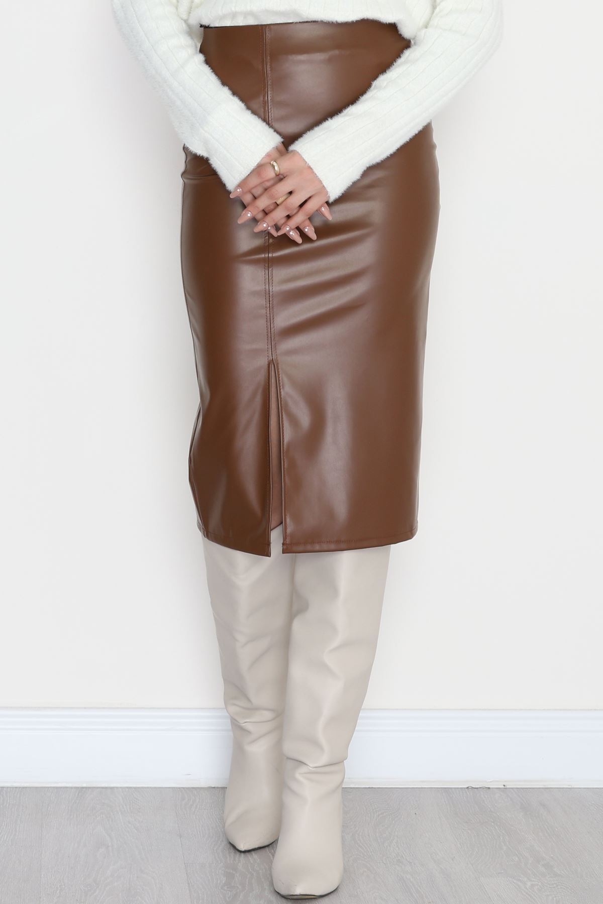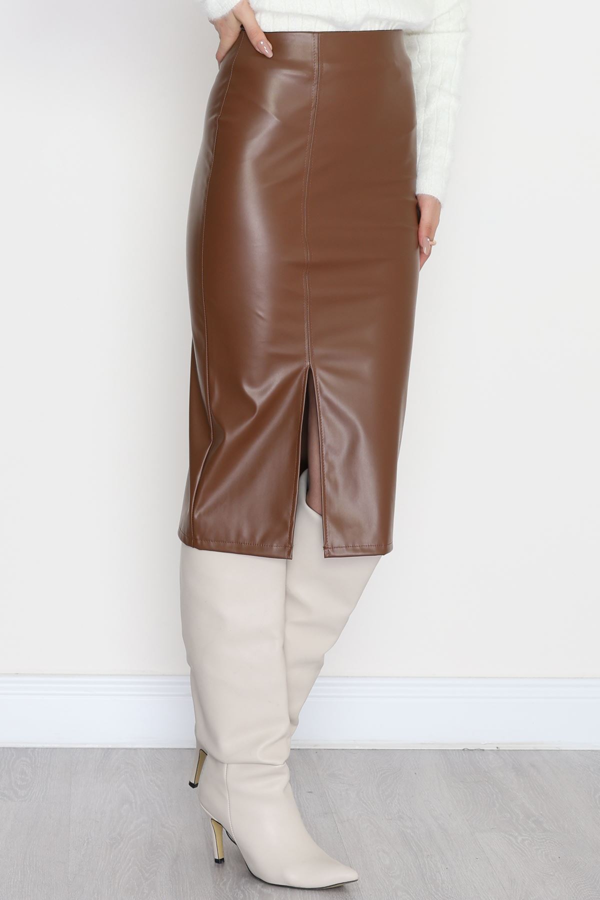 Yırtmaçlı Deri Kalem Etek Kahve - 51018.1779.