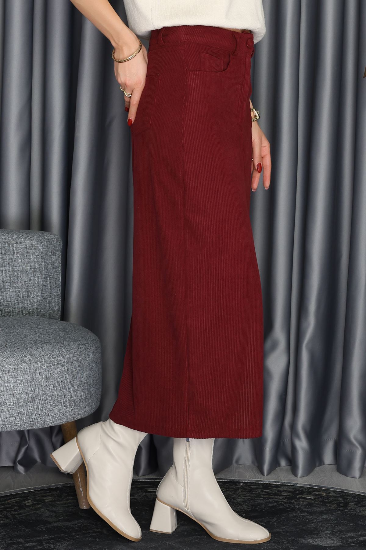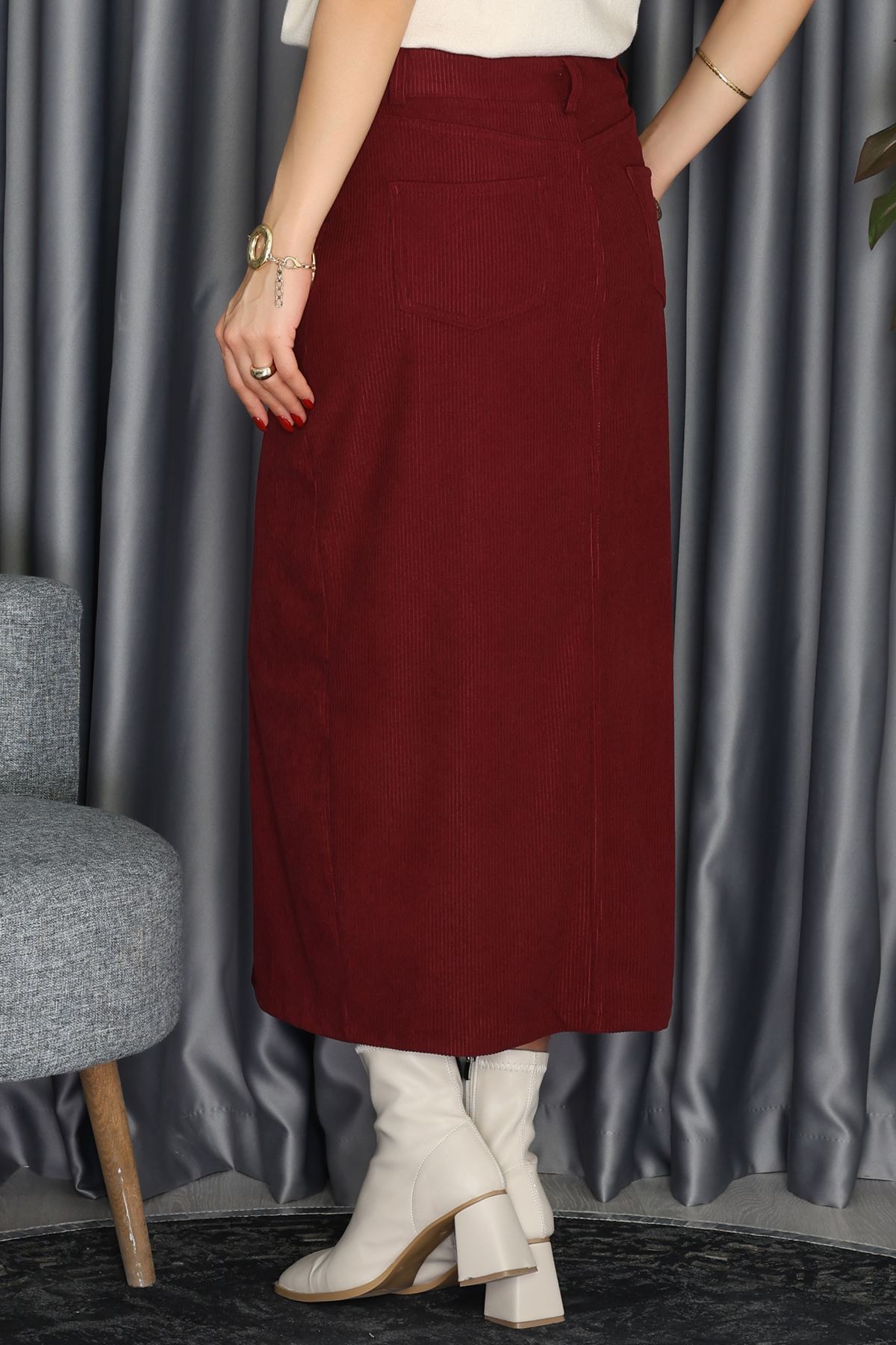 Yırtmaçlı Fitilli Kadife Etek Bordo - 51015.155.