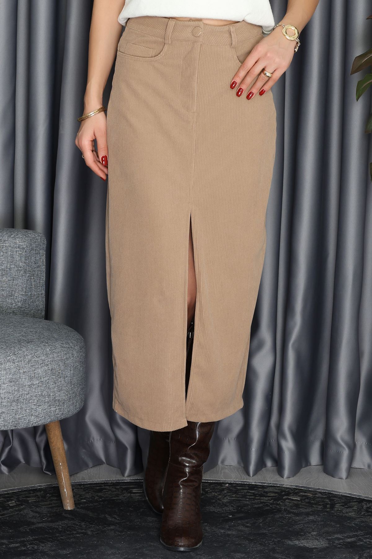 Yırtmaçlı Fitilli Kadife Etek Vizon - 51015.155.